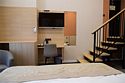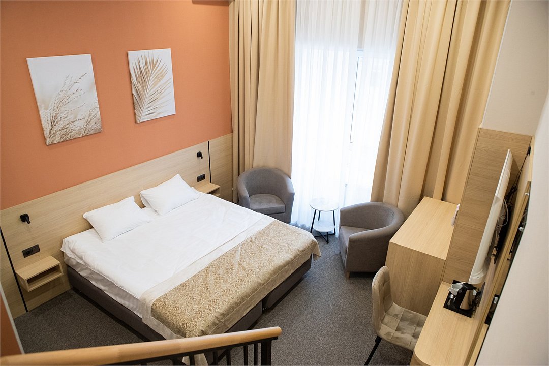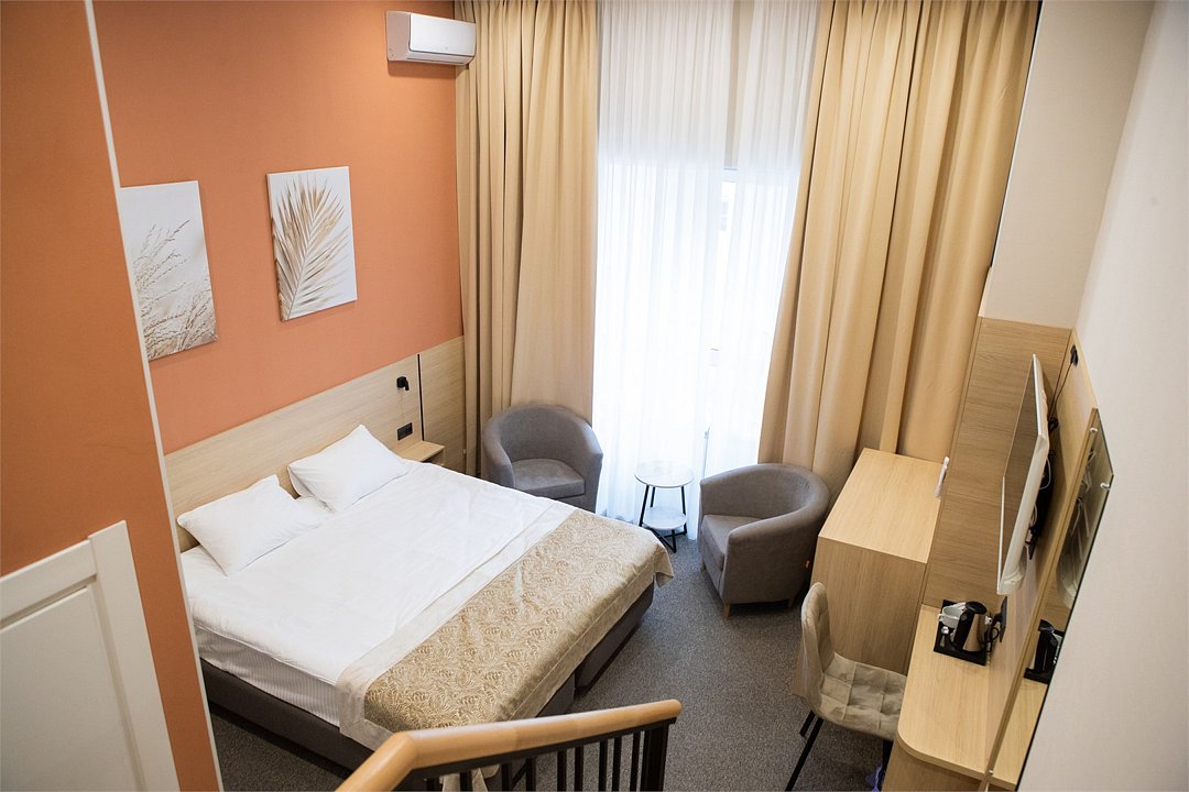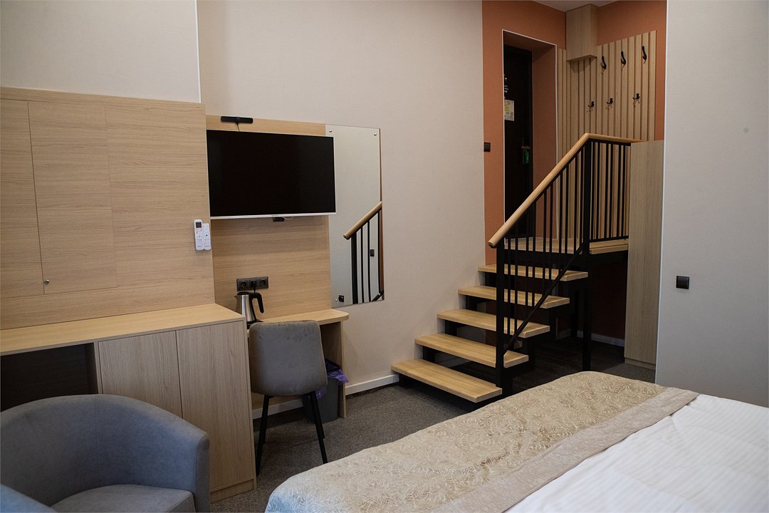 Стандартный улучшенный номер подходит для размещения до 2х человек. Комфортный номер с лестницей оформлен в теплых тонах, создающих уютную атмосферу. Уютная зона отдыха с двумя креслами и столиком располагает к расслаблению и общению. Современные элементы декора придают номеру стильный и современный вид. Расположение мебели обеспечивает удобство и свободное пространство для передвижения. Номер оборудован двуспальной кроватью, которую при необходимости можно разделить на две односпальные. Собственная ванная комната оборудована душевой кабиной с душем. В ванной комнате имеется фен, полотенца и туалетные принадлежности. Все номера Гостевого дома оборудованы кондиционером, мини холодильником, чайной станцией и сейфом.Услуги и удобства