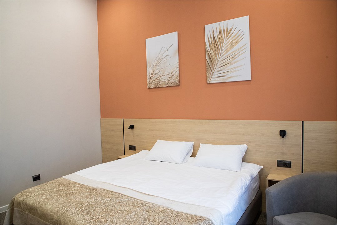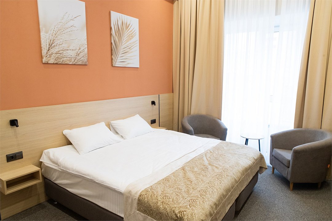 Стандартный номер идеально подходит для размещения до 2х человек. Мягкие цвета стен и текстиль гармонично сочетаются между собой, добавляя обстановке чувство спокойствия и умиротворения. Большое окно пропускает достаточно естественного света, делая помещение светлым и просторным. Уютная зона отдыха с двумя креслами и столиком располагает к расслаблению и общению. Современные элементы декора придают номеру стильный и современный вид. Расположение мебели обеспечивает удобство и свободное пространство для передвижения. Номер оборудован двуспальной кроватью, которую при необходимости можно разделить на две односпальные. Собственная ванная комната оборудована душевой кабиной с душем. В ванной комнате имеется фен, полотенца и туалетные принадлежности. Все номера Гостевого дома оборудованы кондиционером, мини холодильником, чайной станцией и сейфом.Услуги и удобства