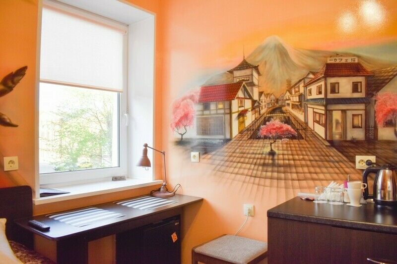 Короткий отпуск с друзьямиОтлично!Пересечение двух главных улиц, на которых находятся всё туристические объект. Старый дом с квартирами поделён на комнаты. Жили в номере под названием Япония. Чисто, уютно. Комната маленькая. В ней установлена большая двуспальная кровать, кухонный стол с мойкой и чайником, есть холодильник, тут же выгорожена крохотная ванная комната с душевой кабиной. Комнате угловая и имеет два окна. Так как было жарко, то устроили сквознячок. Несмотря на небольшой размер комнаты переночевали очень комфортно. Кровать удобнейшая! Окна выходят на памятник Милютину и камерный театр. Время смотрели на его часах. Часы даже негромко бьют. Это абсолютно не мешало, а наоборот было как-то антуражно. Кроме того здание немного отодвинуть от улицы и её шум не слышен. Завтрак принесли в номер: при заселении отмечаешь в меню что будешь есть и во сколько принести. Парковка рядом. Если паркующиеся не вздумают шуметь, то ничего не мешает. На фото-вид из окна.