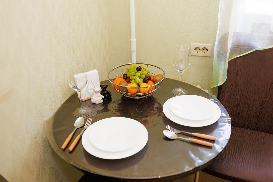 - всё необходимое уже есть в квартире (оборудованная кухня, посуда, всё для приготовления еды, микроволновка, телевизор, телевидение, ванна/душ, утюг, гладильная доска).