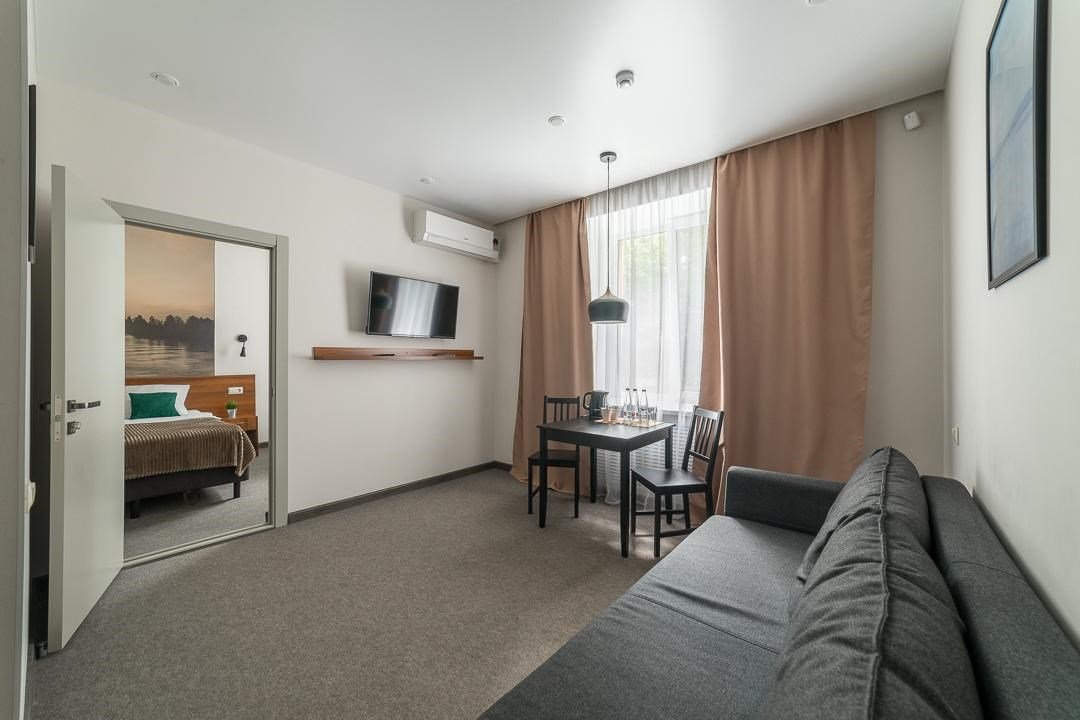 Wi-Fi, кондиционер, светильник, фен, ванная комната, халаты, банные полотенца, тапочки, косметические средства, две односпальные или большая двуспальная кровать, диван, стулья, вешалки, две комнаты, сейф, унитаз, раковина, ковровое покрытие, душ, кулер на этаже, вид во двор, высокие потолки, стол, тумба, туалетные средства, цифровое тв, диван-кровать, мини-холодильник, шкаф-купе, гостиничная парфюмерия, номер для некурящих, холодильный шкаф, мылоВ номере