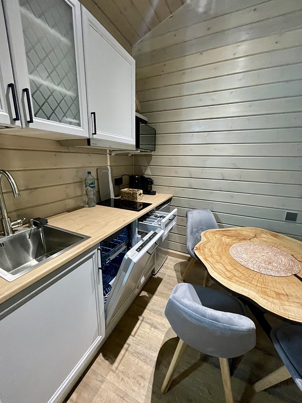 - оборудованная кухня (кофемашина, холодильник, индукционная варочная панель, печь СВЧ, чайник, набор сервировочной посуды, посуда для приготовления пищи);