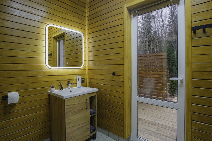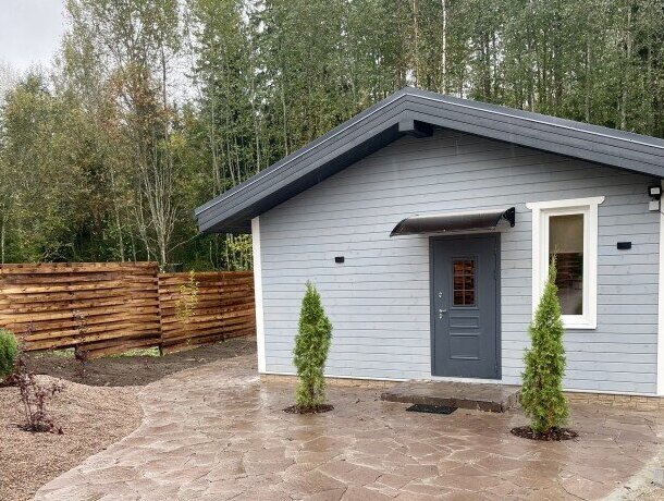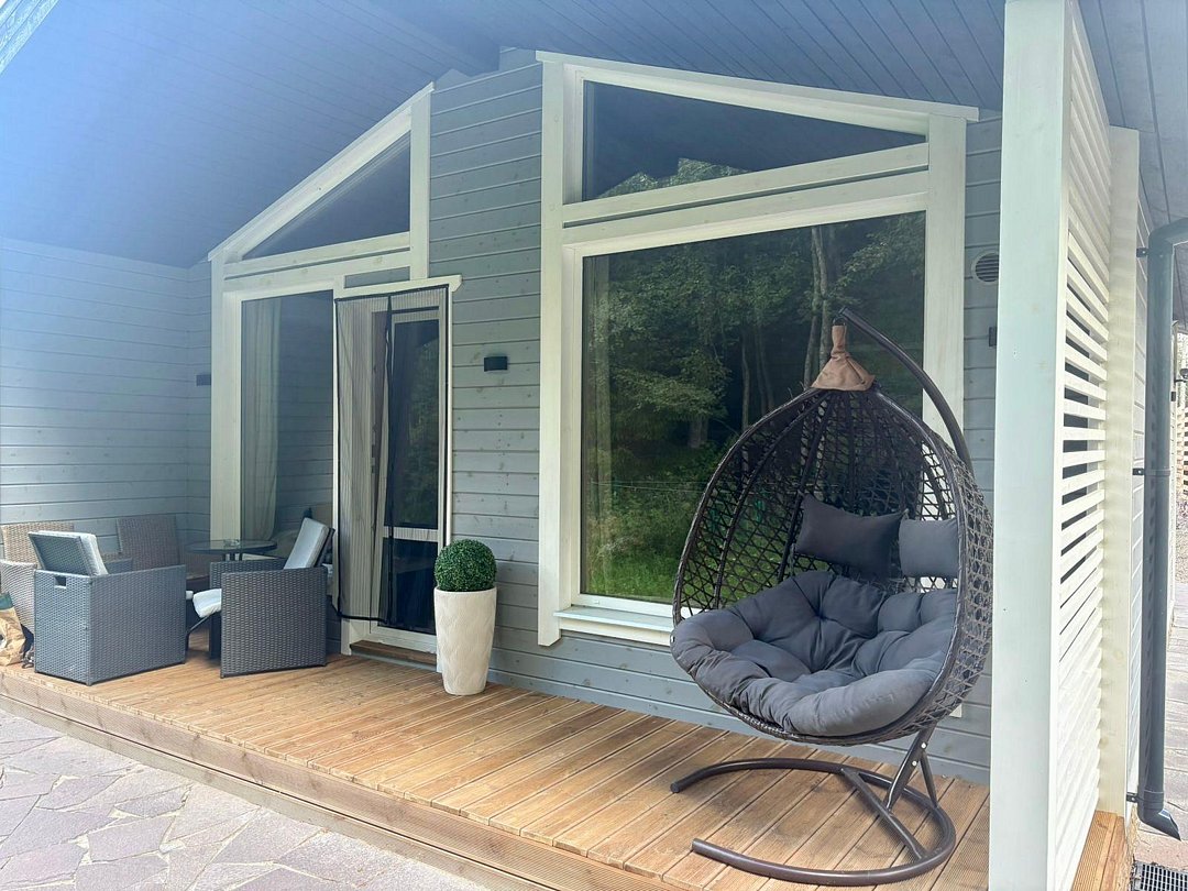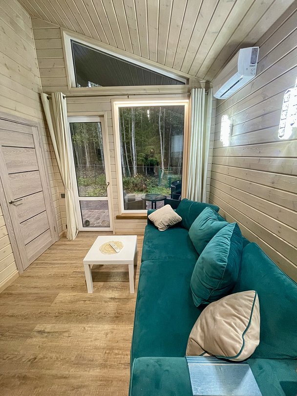 Комфортный загородный отдых в гармонии с природой. Коттедж SkandyVillage с одной спальней и гостиной оформлен в скандинавском стиле с панорамными окнами с видом на лес. В нем соединился домашний уют, современный дизайн и удобство.
