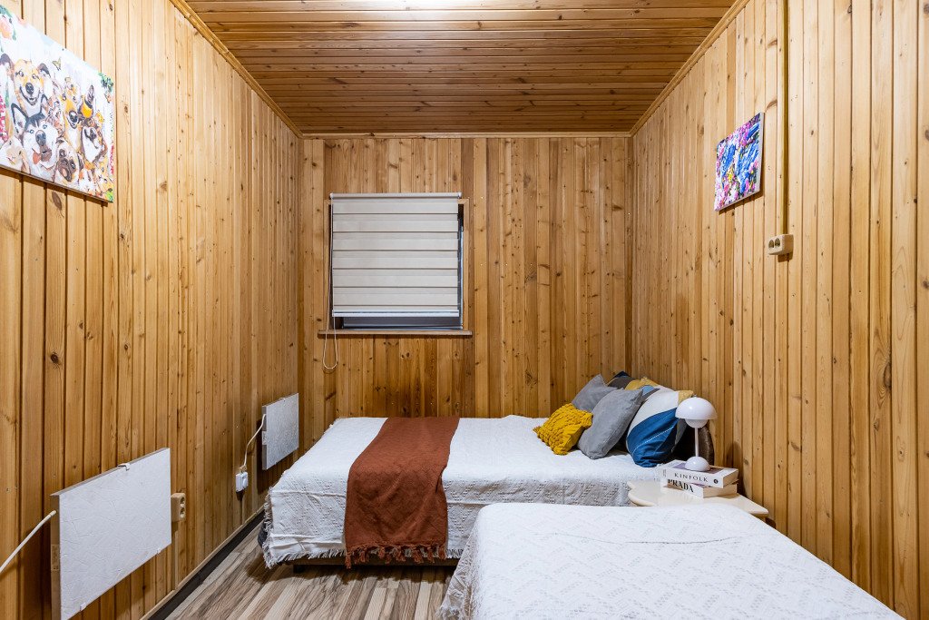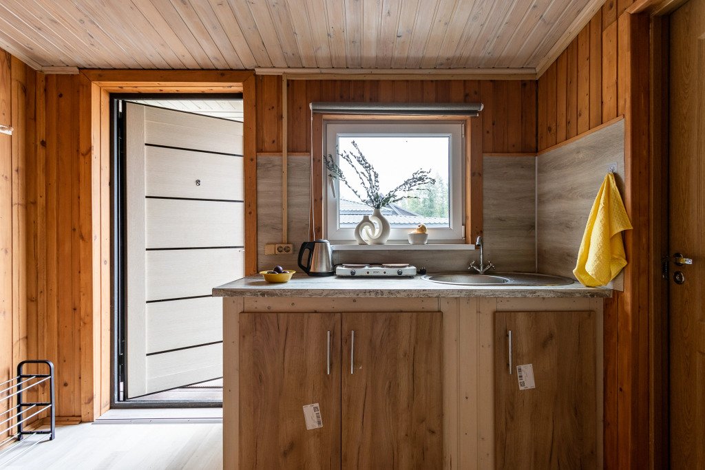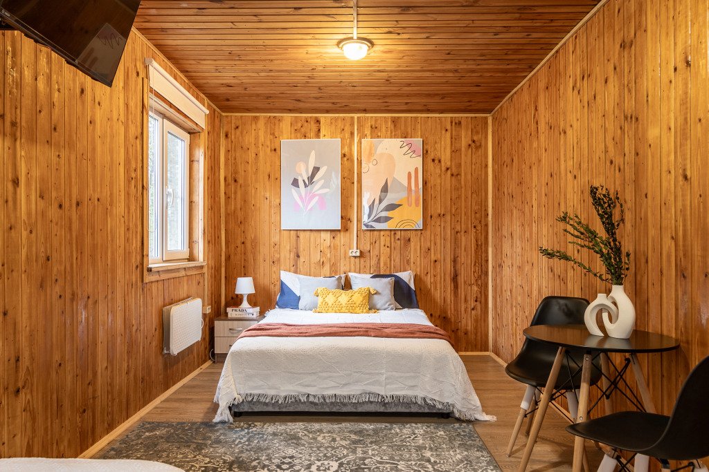 Гости размещаются в домиках, оборудованных мебелью и техникой.