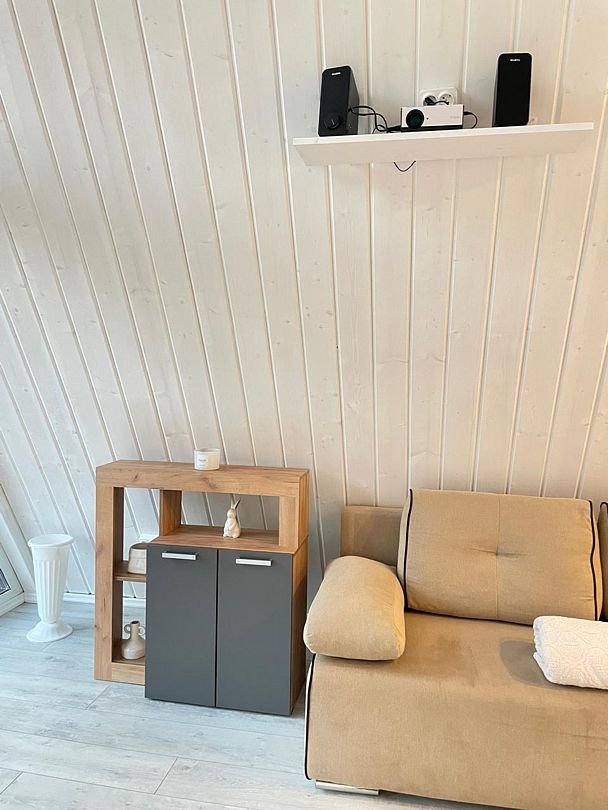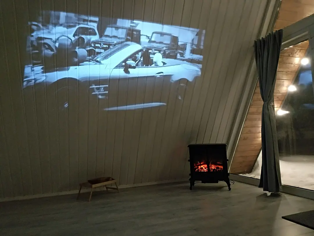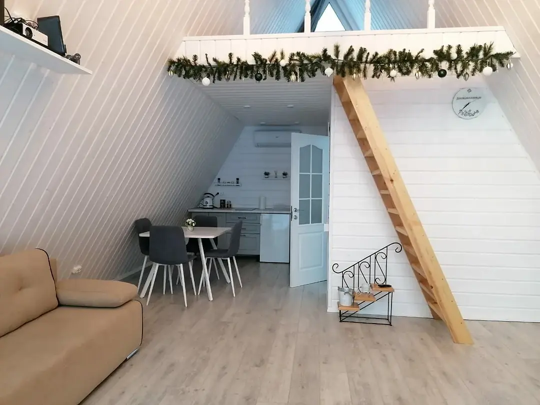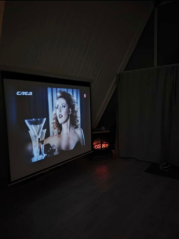 Вам будет доступен Wi-Fi и проектор для просмотра ваших любимых фильмов на Кинопоиске, Иви и других сервисах. Теплые полы, гостиная с панорамными окнами и раскладным диваном создают атмосферу уюта, а на втором этаже расположен двуспальный матрас размером 180х200.