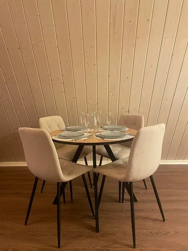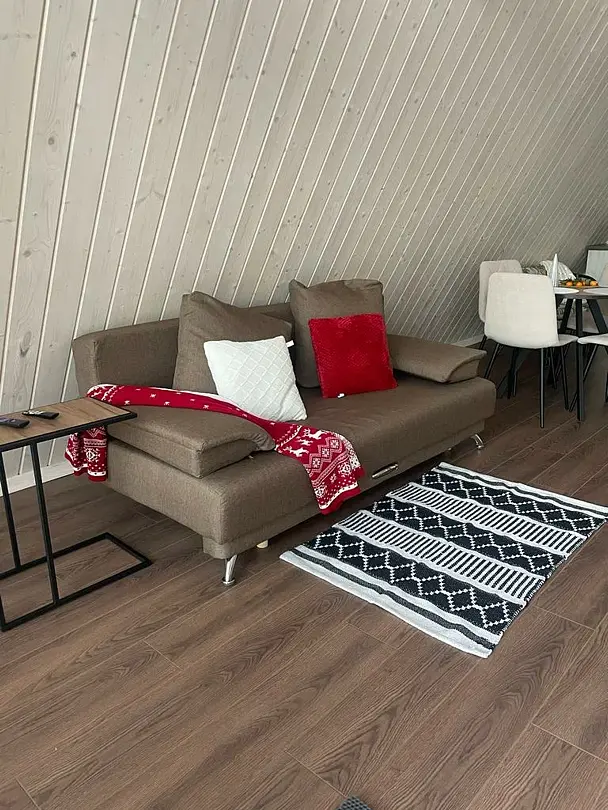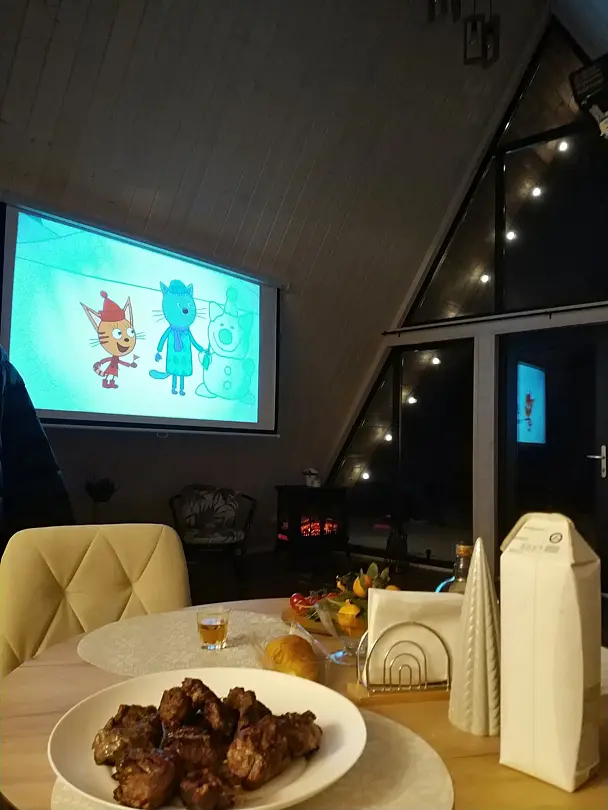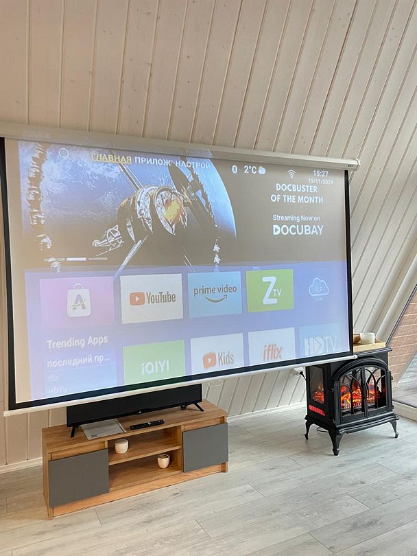 Также в наличии Wi-Fi и проектор для просмотра ваших любимых фильмов на Кинопоиске, YouTube и других платформах. Теплые полы добавляют уюта, а гостиная с панорамными окнами и раскладным диваном создает атмосферу спокойствия.