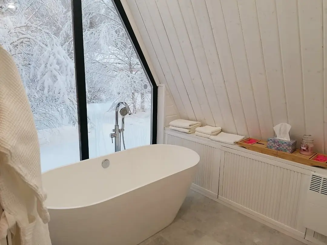 В доме вас ждет санузел с мраморной отдельно стоящей ванной и панорамным окном, из которого открывается потрясающий вид на лес. Предоставляются полотенца, халаты и средства гигиены, такие как шампуни, гели для душа и зубные щетки. Полноценная кухня оснащена необходимой техникой и посудой, включая холодильник.