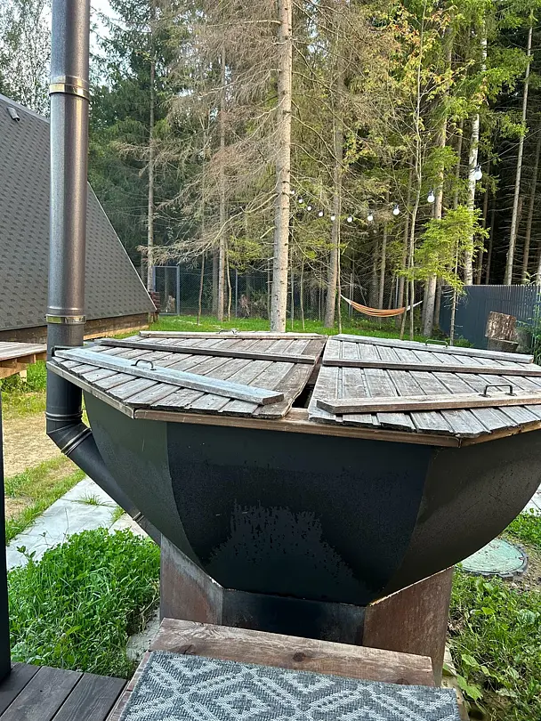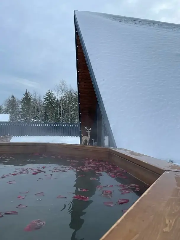 На территории домика A-FRAME в Назимихе вас ждет сибирский банный чан, который топится дровами. В любое время года вы сможете насладиться парением в воде под открытым небом.