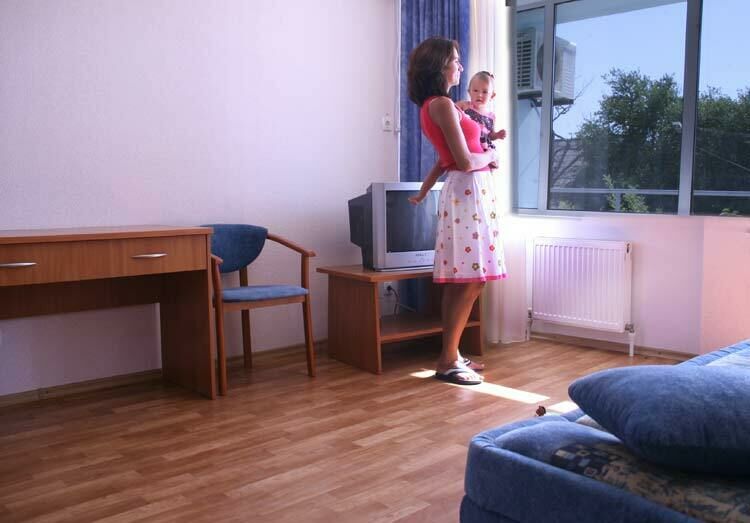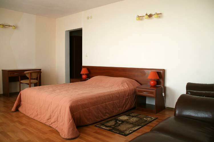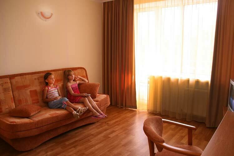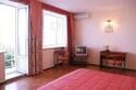 В номере: двуспальная или две односпальные кровати, 2 прикроватные тумбочки, 2 стула, письменный и журнальный стол, раскладной диван, шкаф, холодильник, кондиционер и спутниковое ТВ, балкон. Доп. место - раскладной диван