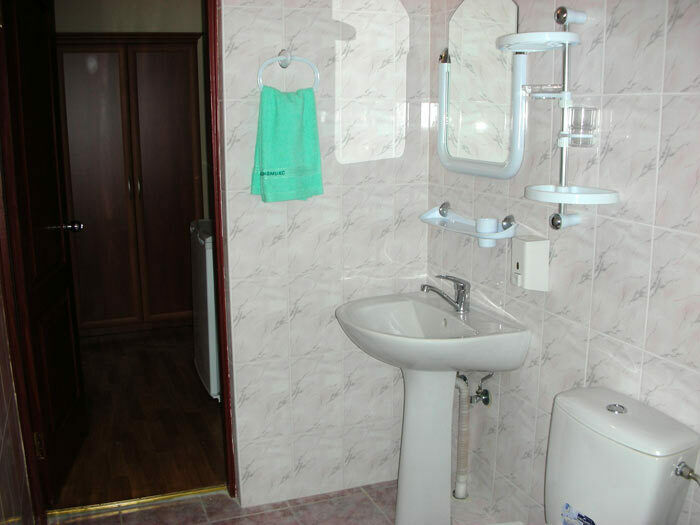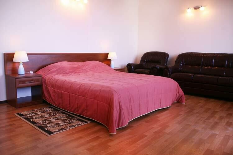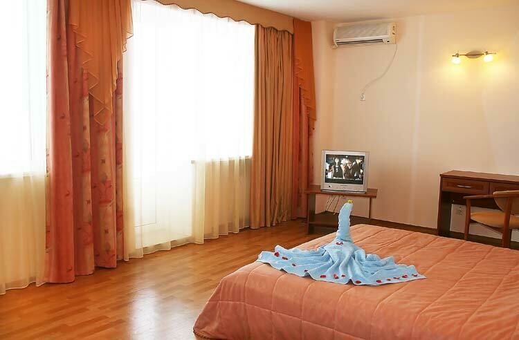 В номере: двуспальная кровать, 2 прикроватные тумбы, стул, кожаный диван и кресло, письменный и журнальный стол, электрочайник и фен (только в номере VIP), шкаф и тумба для обуви, холодильник, кондиционер, спутниковое ТВ, балкон. Доп. место - раскладной диван