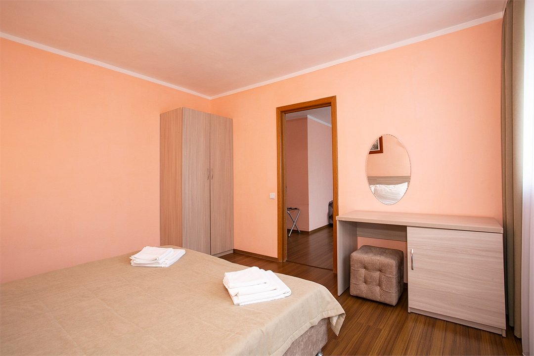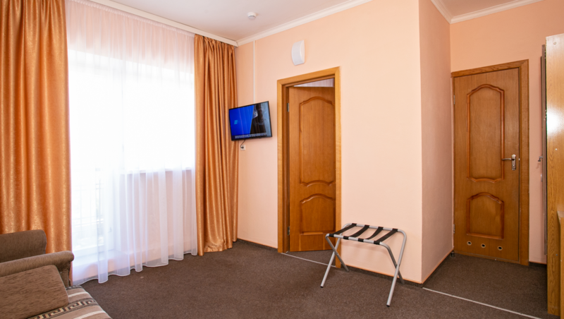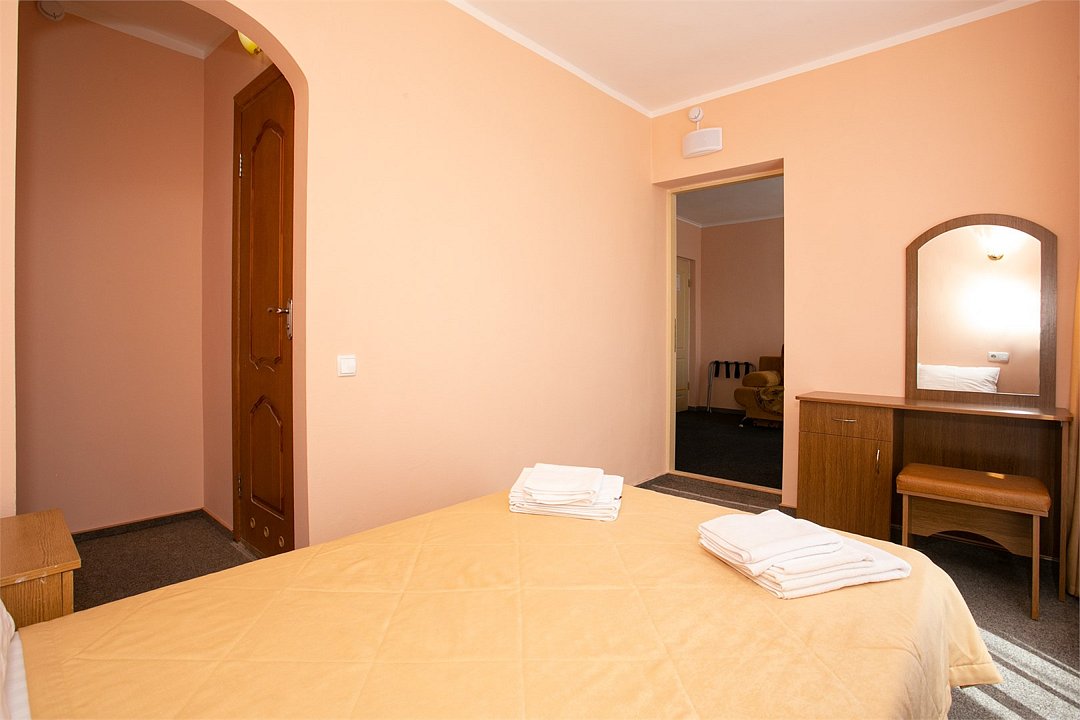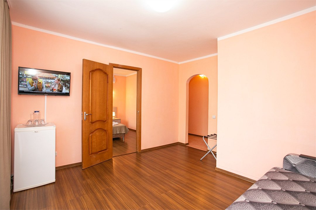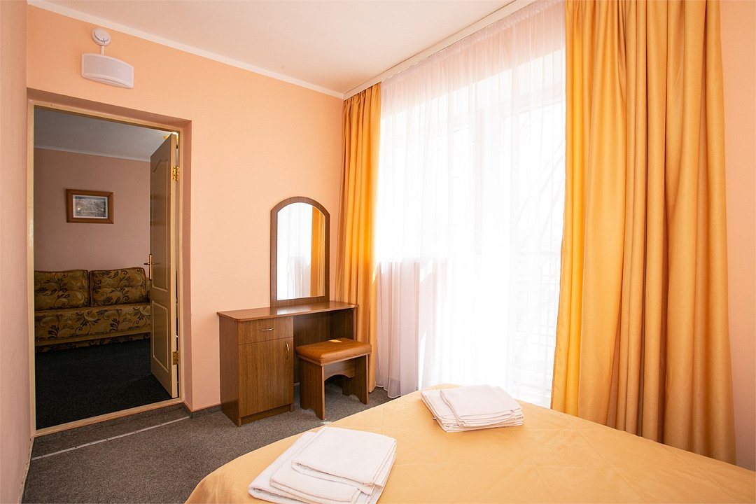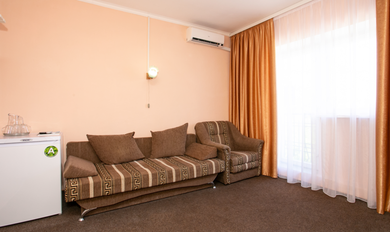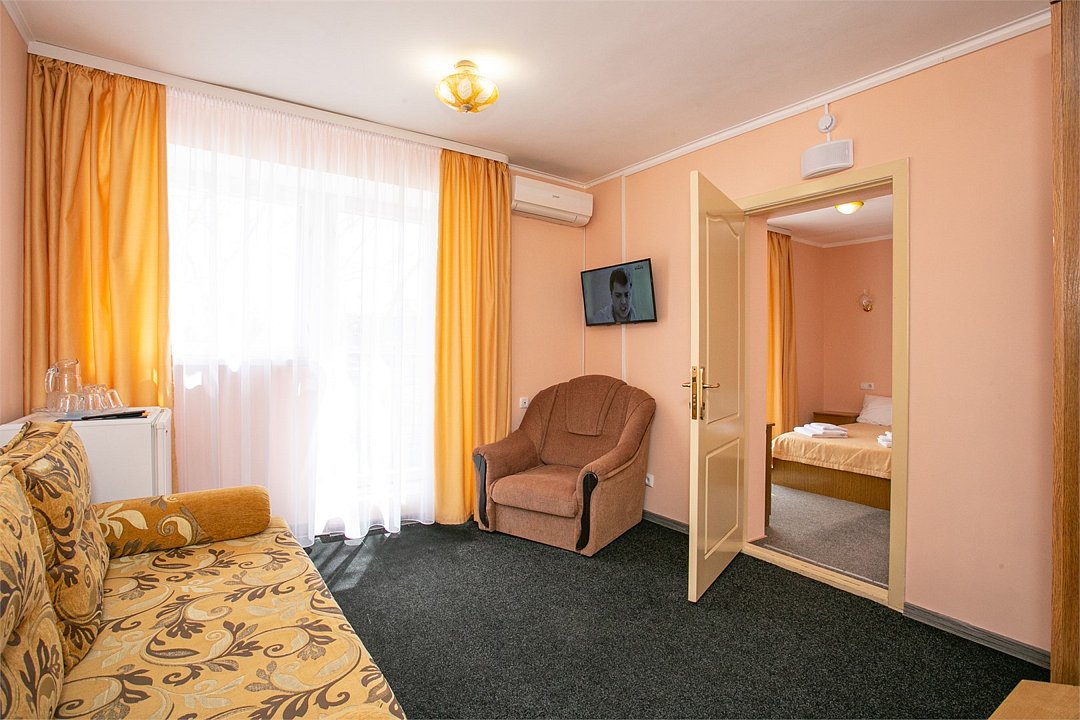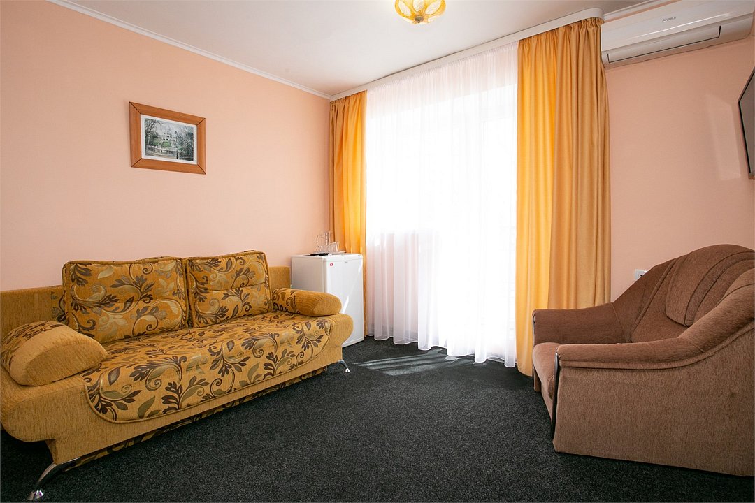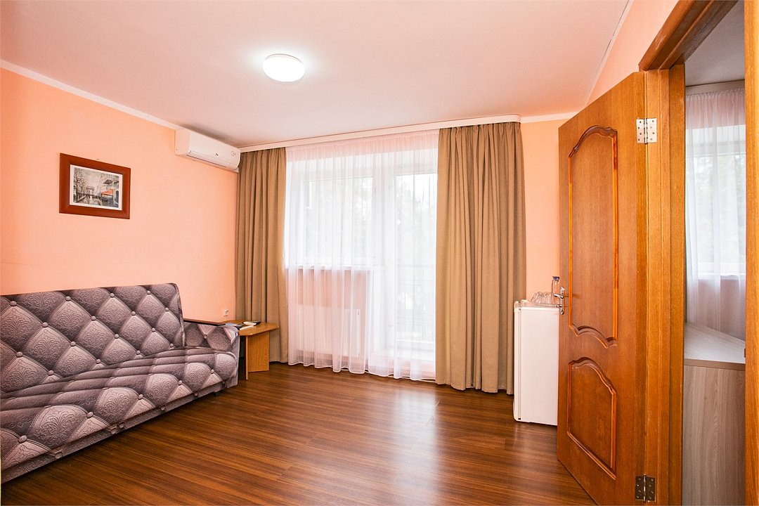 Комфортабельный 2-местный 2-комнатный номер с одной двуспальной кроватью, диваном-кроватью и раскладным креслом. В числе удобств — телевизор с кабельным телевидением, мини-холодильник, кондиционер, багажная стойка. В ванной комнате каждого номера есть душ и бесплатные туалетно-косметические принадлежности.Услуги и удобства