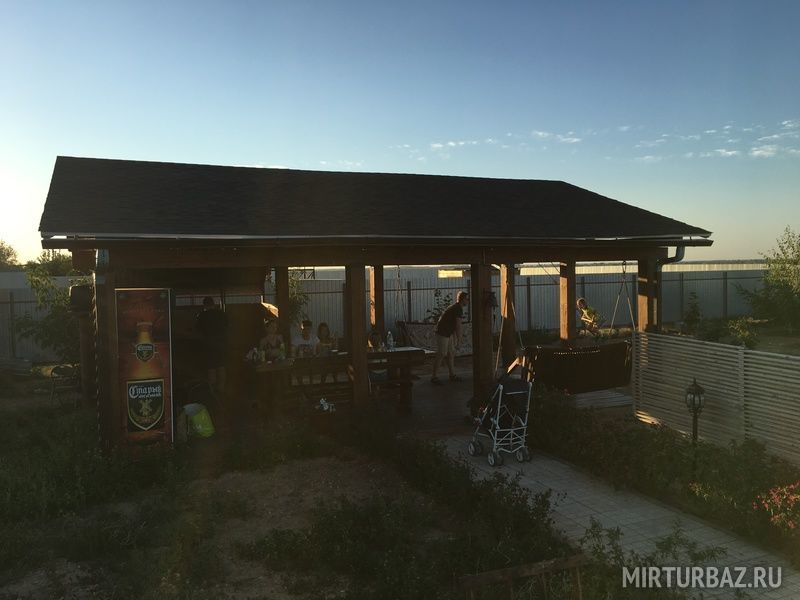 Беседка из цельных брусов на 20 человек, полностью оборудованная (холодильник, мойка, разделочная поверхность, газовая плита, мангальная, 2 качелями взрослыми и 1 детскими, огромный стол с лавочками и креслокачалкой);