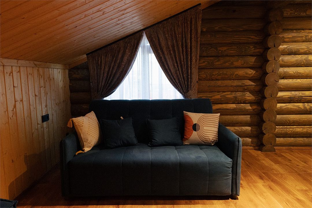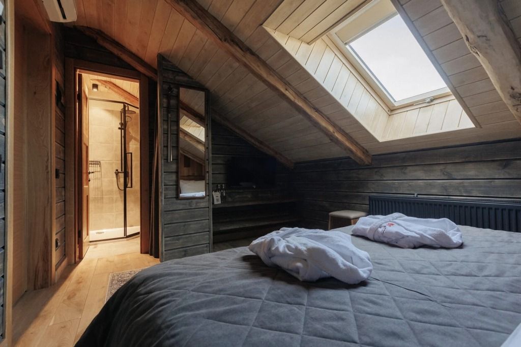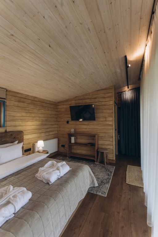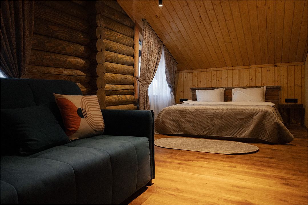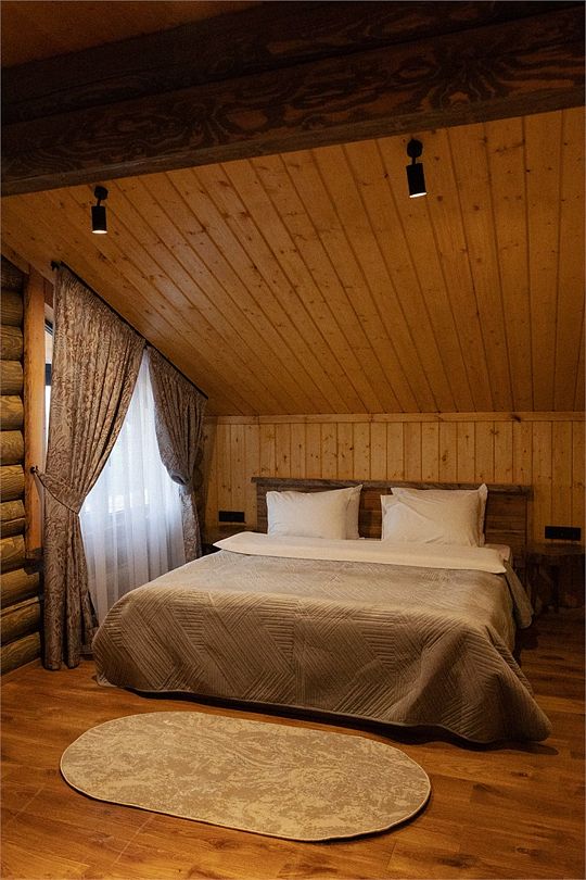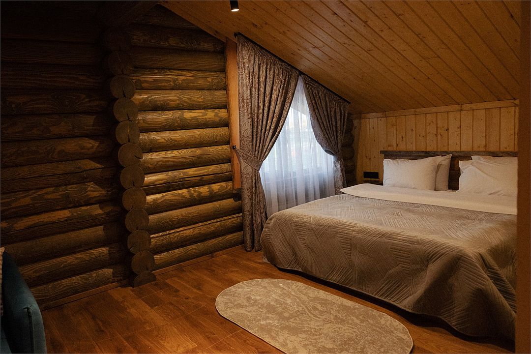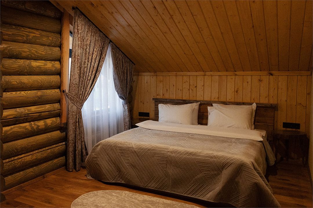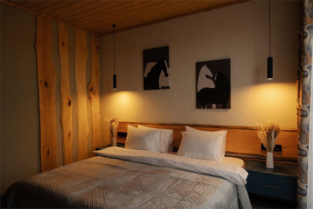 Современный оборудованный номер, выполненный в эко- классическом стиле располагается в гостевом доме "Гранд Шале". Имеет отельный вход и вид во дв