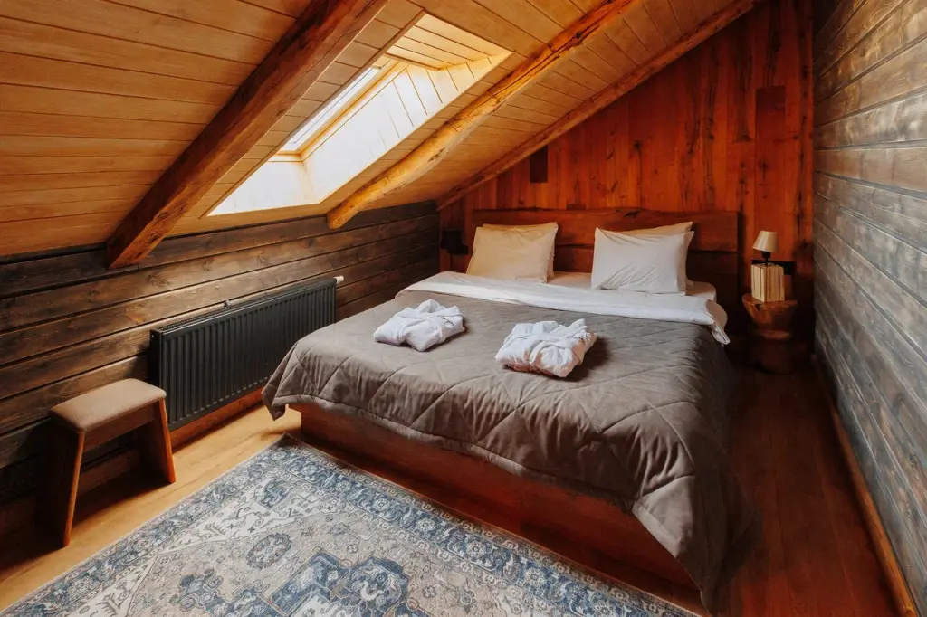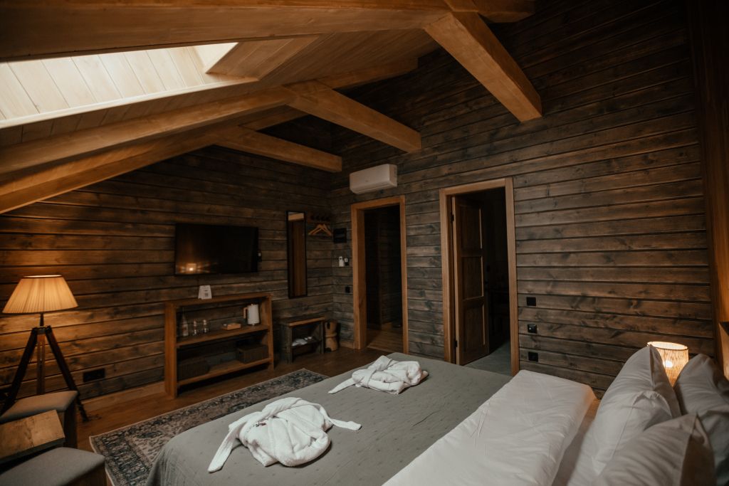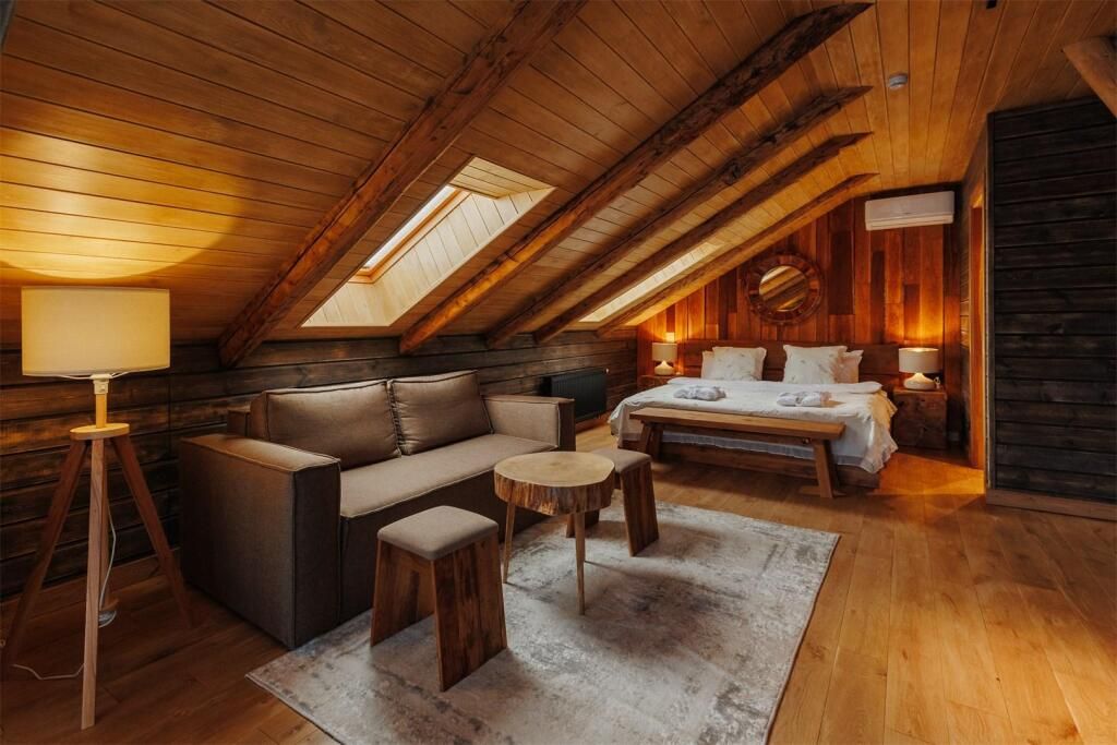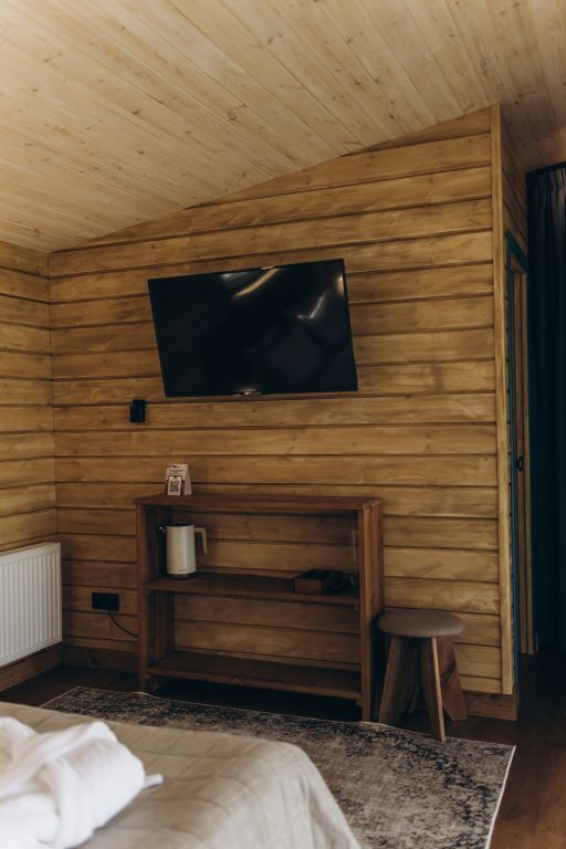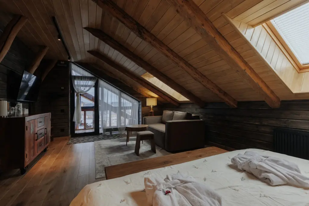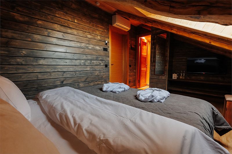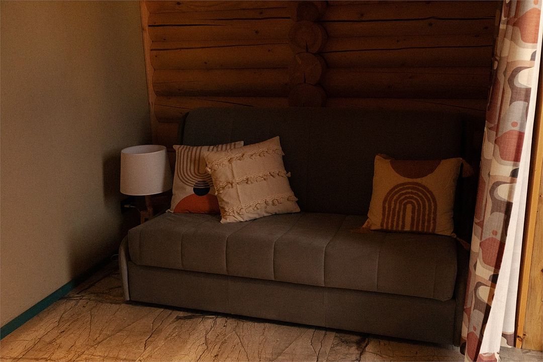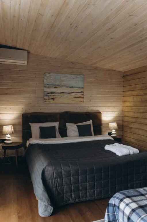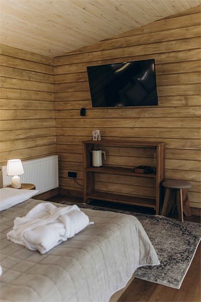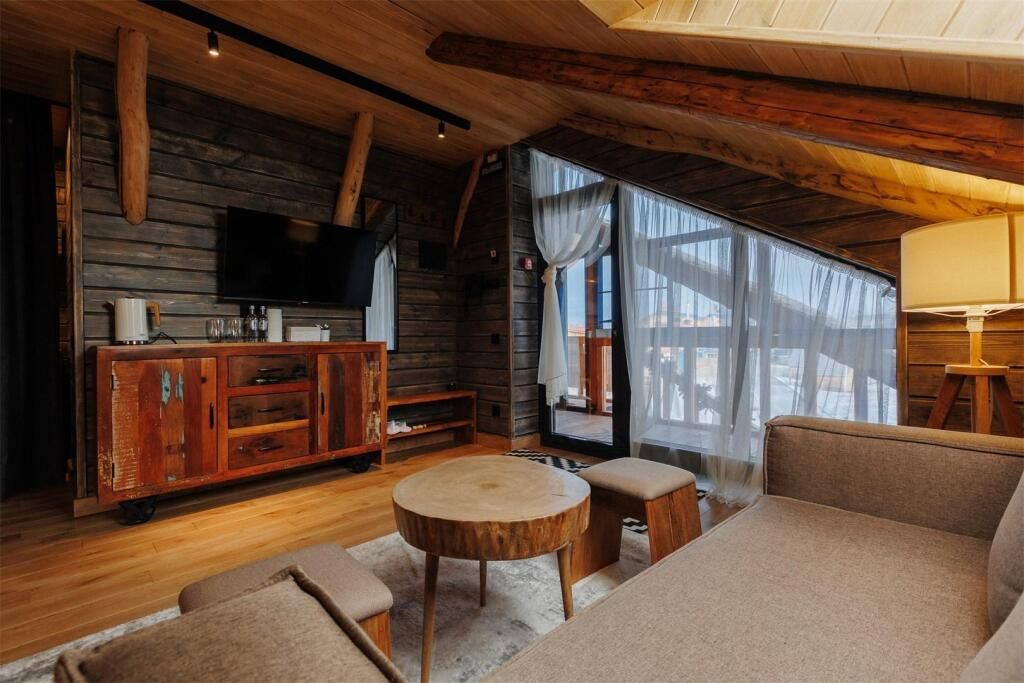 Современный оборудованный номер, выполненный в эко- классическом стиле располагается в гостевом доме "Гранд Шале". Имеет отельный вход и вид во дв
