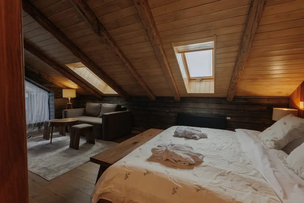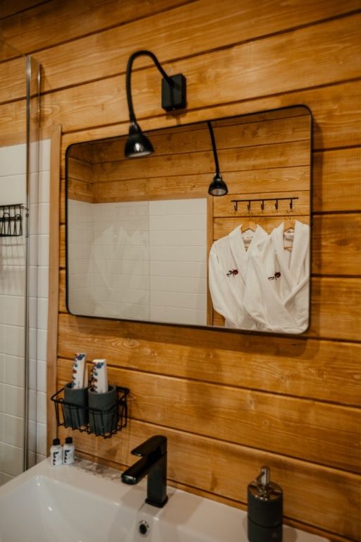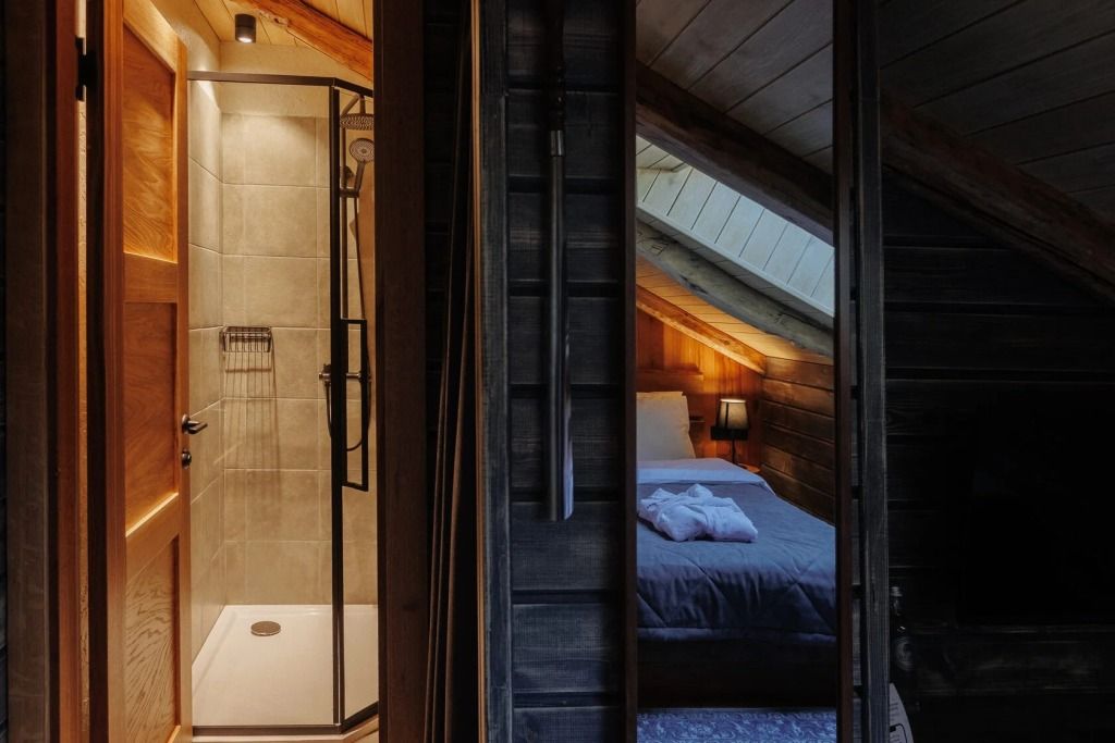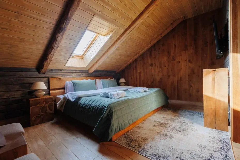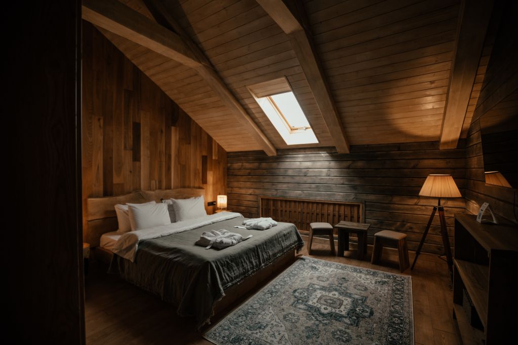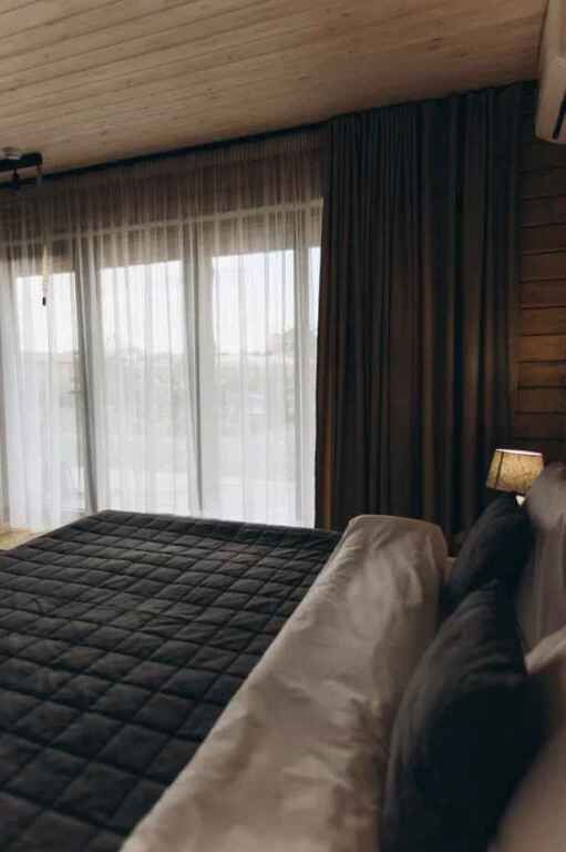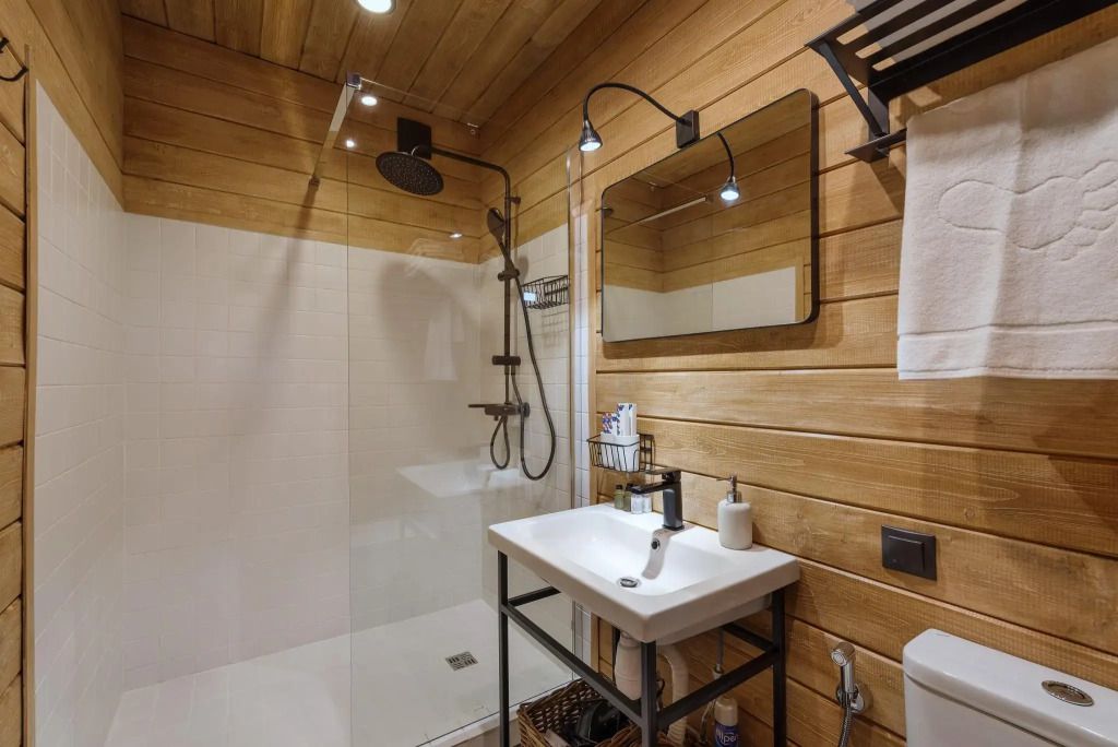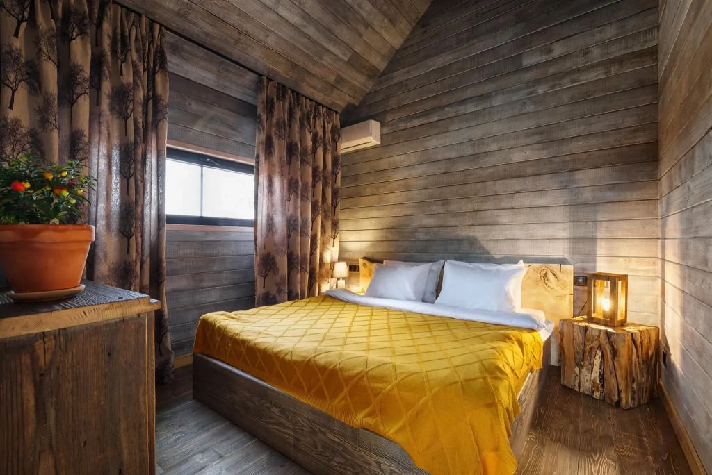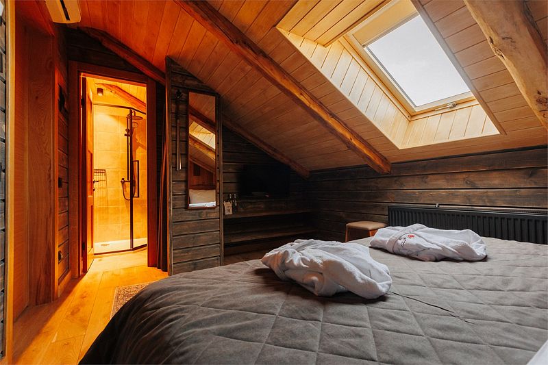 Современный оборудованный номер, выполненный в эко- классическом стиле располагается в гостевом доме "Гранд Шале". Имеет отельный вход и вид во дв