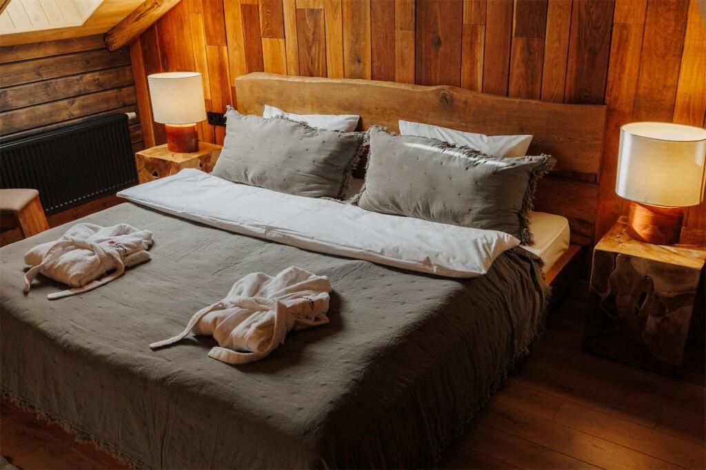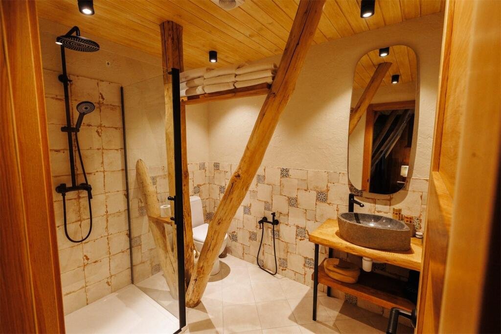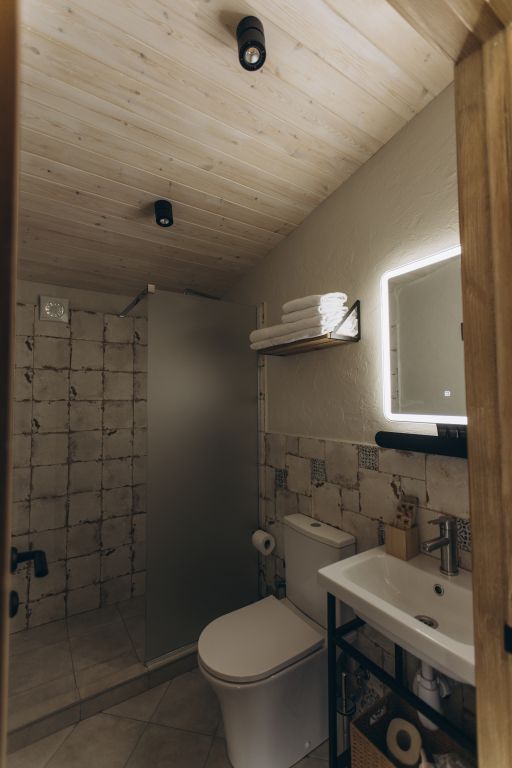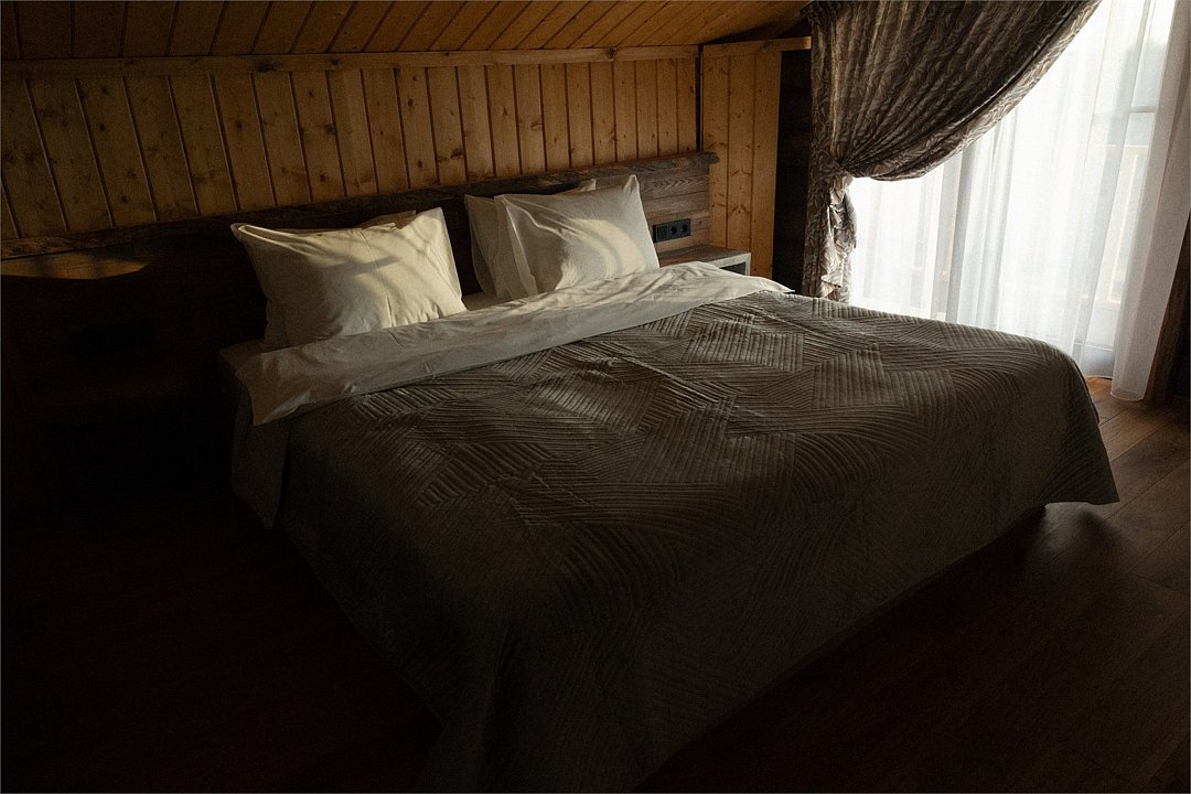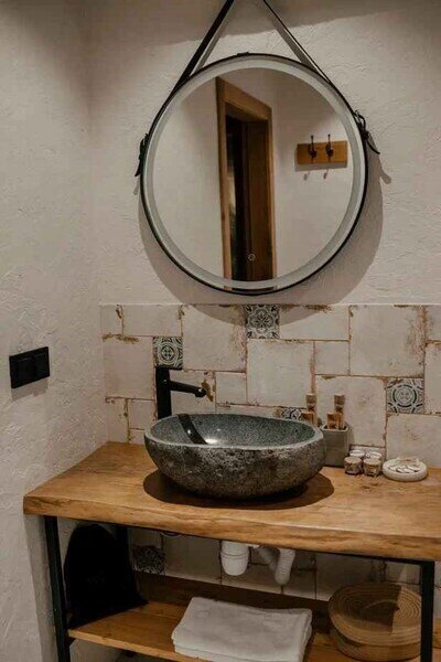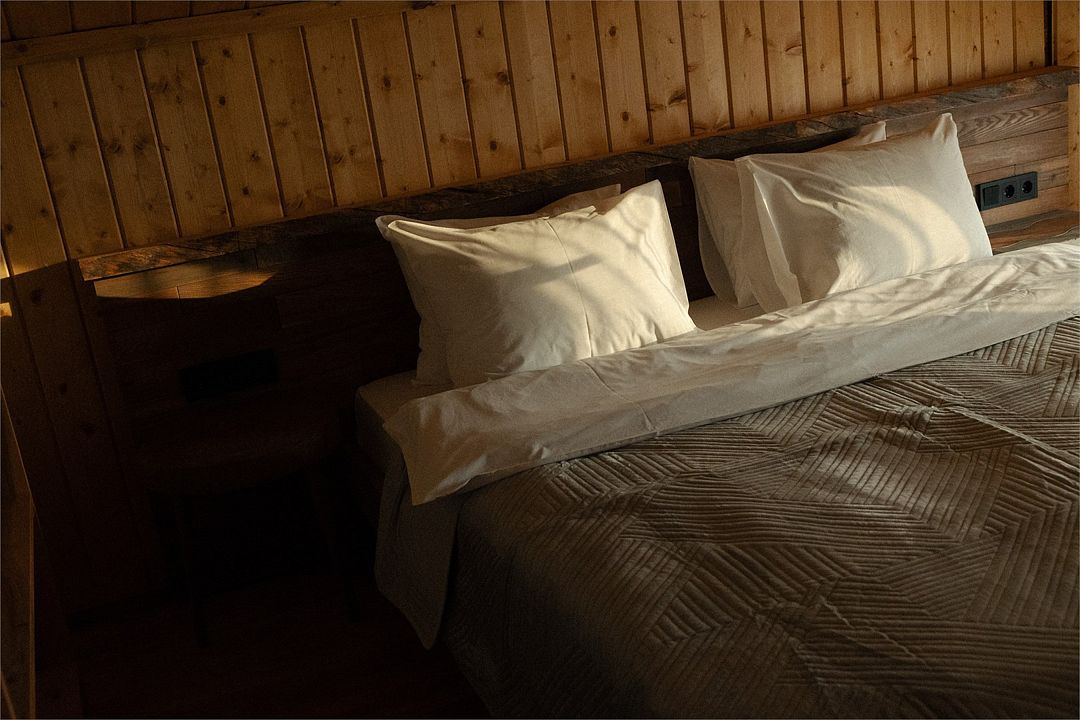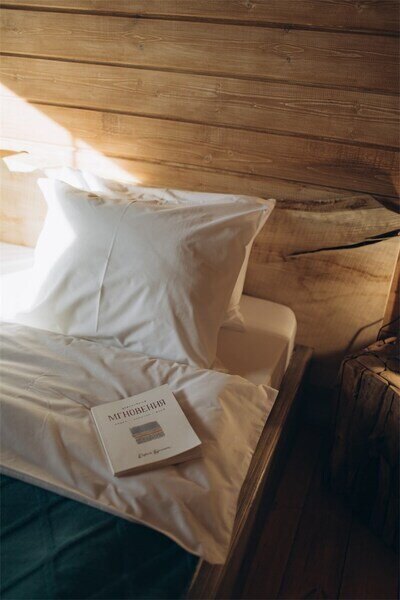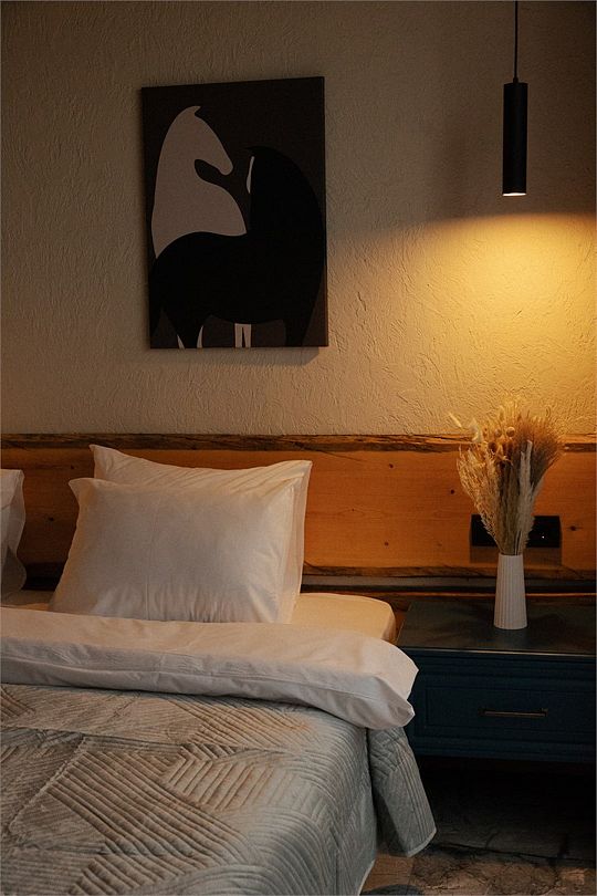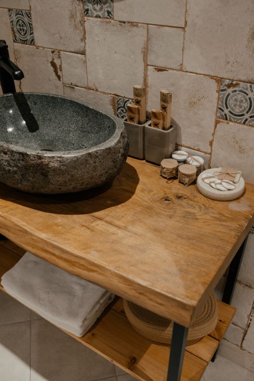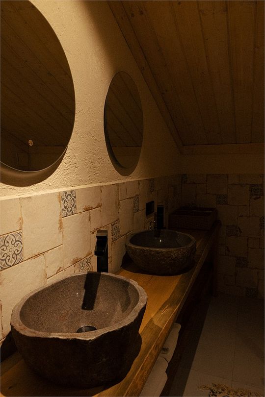 Важным аспектом стало сочетание натуральных, естественных текстур и фактур. Мебель и оформление номеров мы подбирали у локальных ремесленников, ведь именно предметы, сделанные руками создают неповторимую атмосферу. Полы из массива дуба, сантехника их натурального камня, подушки и постельное бельё из жатого льна и хлопка, расшитое вручную.