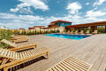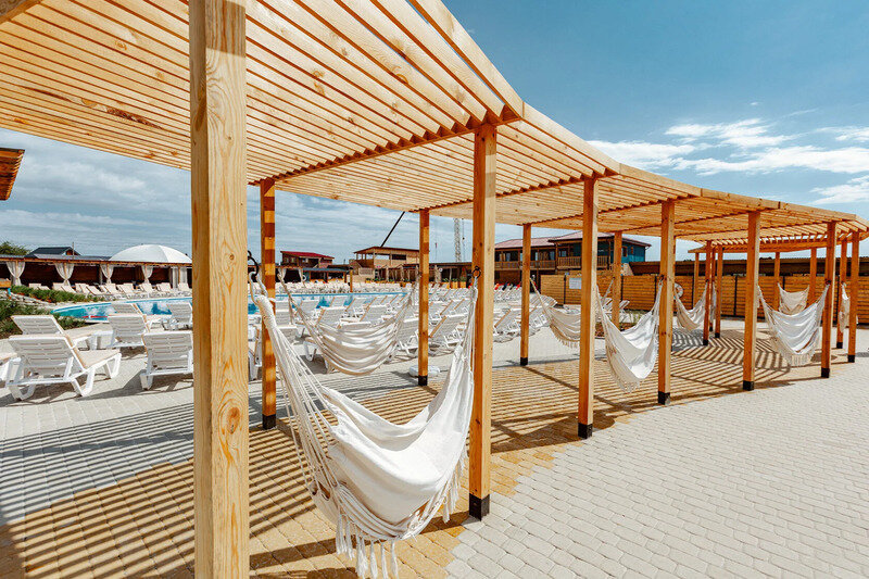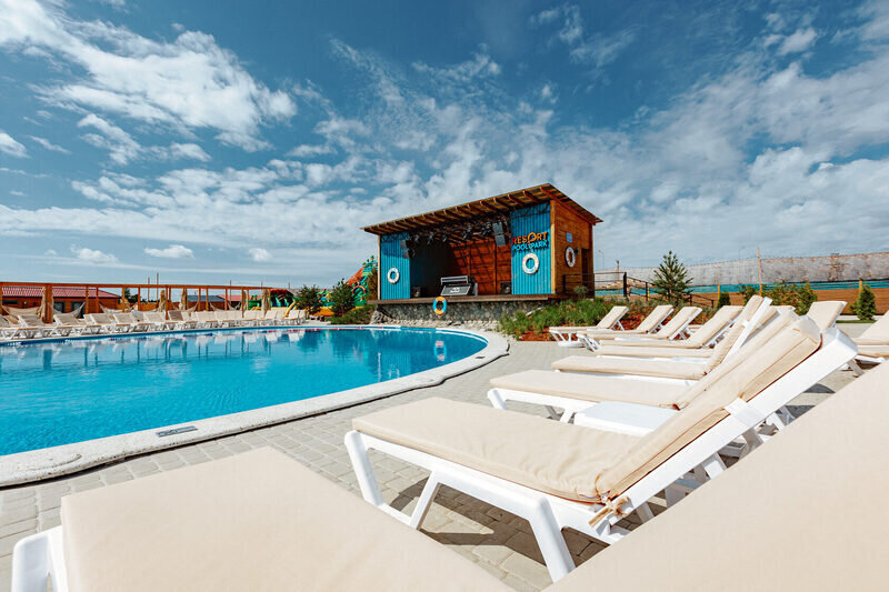 Почувствуйте себя на курорте на берегу океана! Настоящий песчаный пляж на обширной территории Парка Resort Pool Park с лежаками для комфортного отдыха.