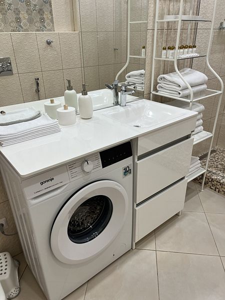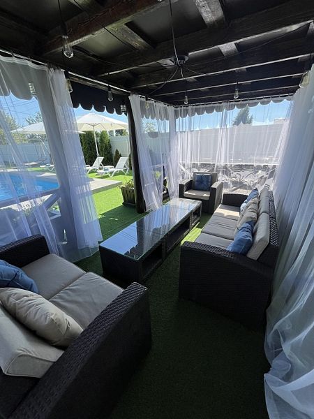 Гостевой дом подходит для отдыха с семьёй и друзьями, а также для организации праздничных мероприятий. В доме имеется кухня-гостиная со столом на 10 персон, необходимая посуда и бытовая техника, включая посудомоечную машину, духовой шкаф, кофе-машину, тостер и чайник. Имеется четыре спальни с кроватями с ортопедическими матрасами: 2 спальни с кроватью 160x200, 1 спальня с кроватью 180x200 и 1 спальня с двумя кроватями 140x200. Предусмотрена детская кровать 80x120. Каждая комната оснащена платяными шкафами, комодами, прикроватными тумбочками, кондиционерами, халатами и тапочками. Есть два санузла с ванной, душевой, стиральной машиной и средствами гигиены.