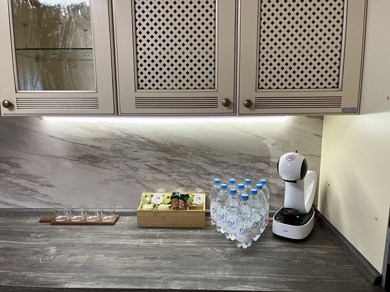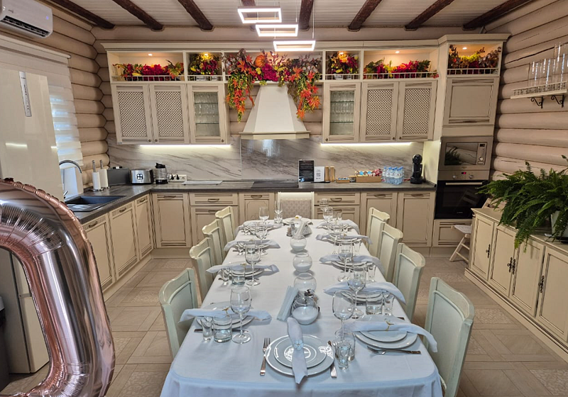 Кухня-гостиная: просторный стол на 10 персон, вся необходимая посуда и бытовая техника, включая посудомоечную машину, духовой шкаф, кофе-машину, тостер, чайник.