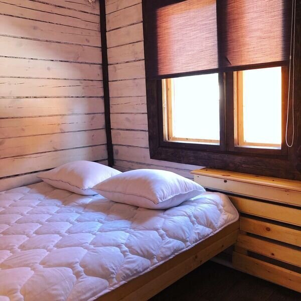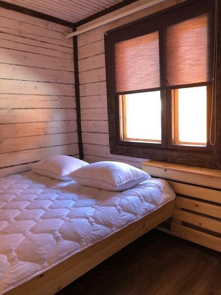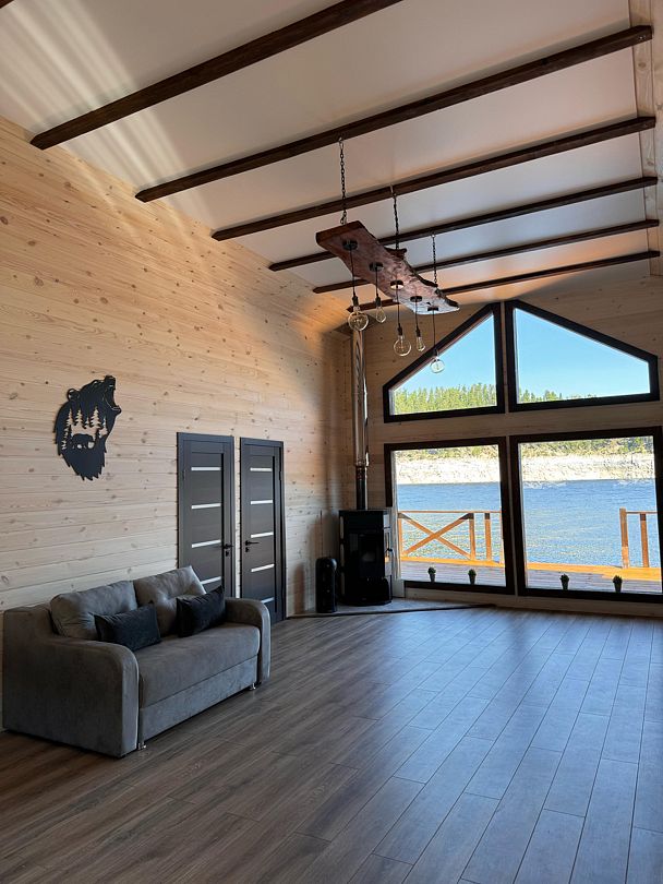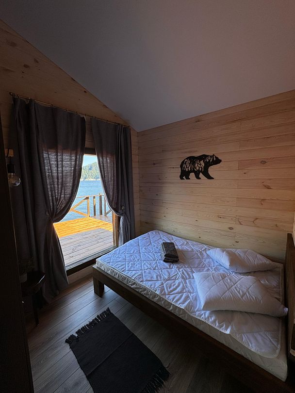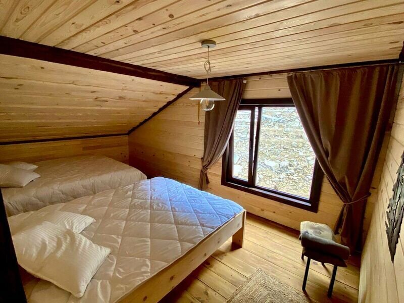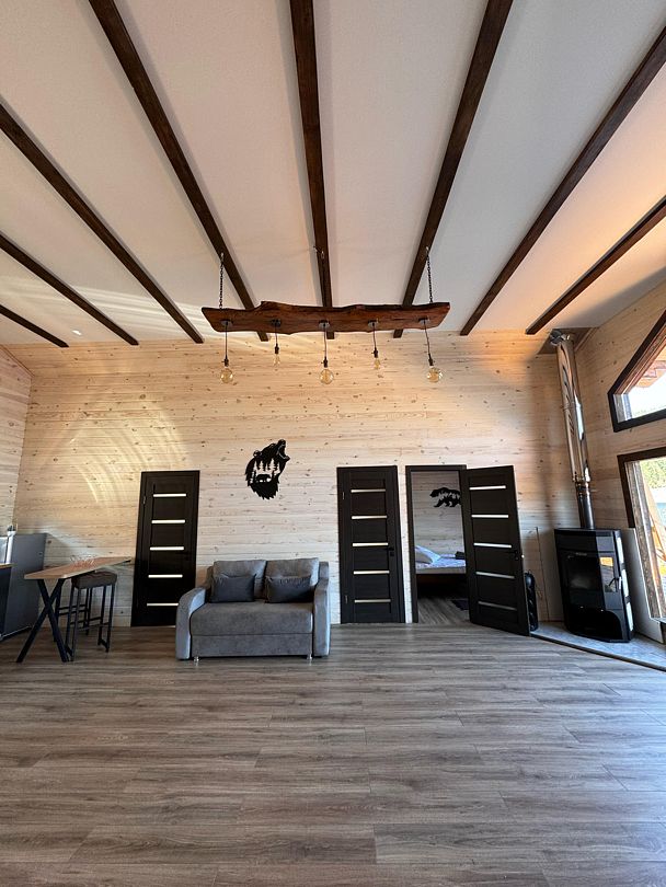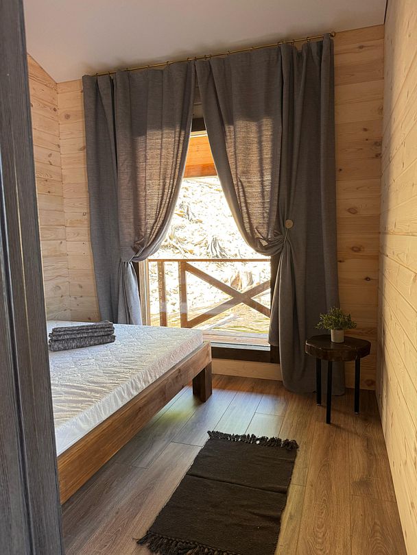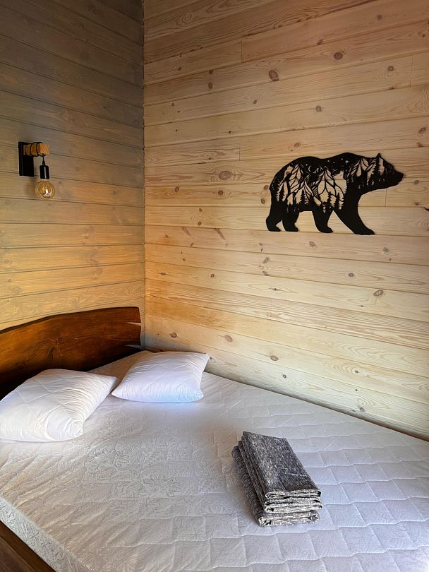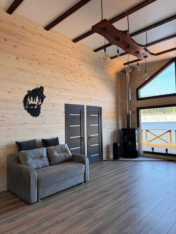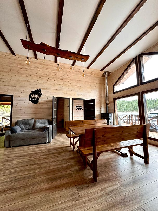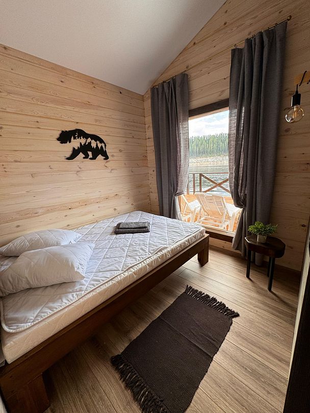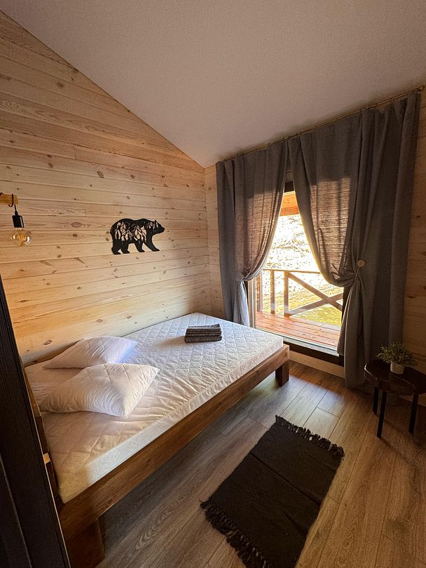 - уютными, большими спальными номерами с панорамными окнами в современном экологическом стиле (пять 2-х местных номеров, большой диван в гостиной). Итого 12 полноценных спальных мест;