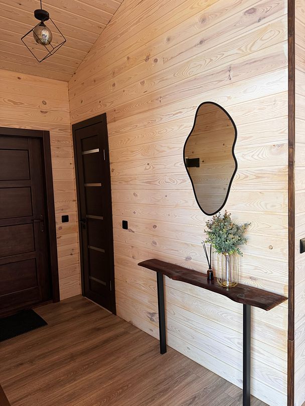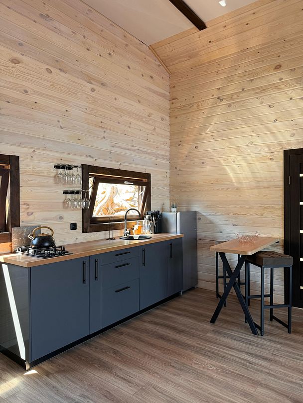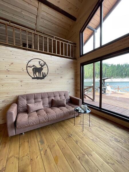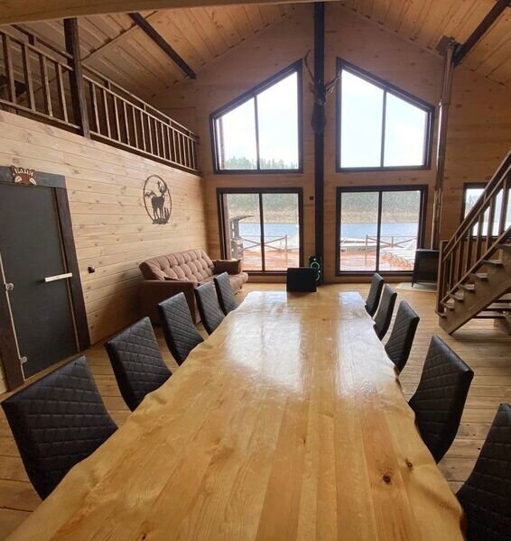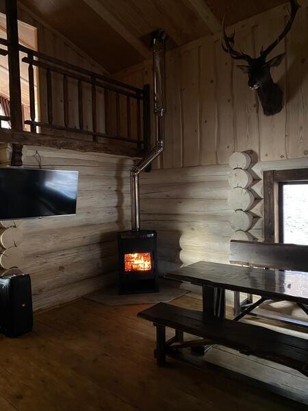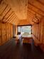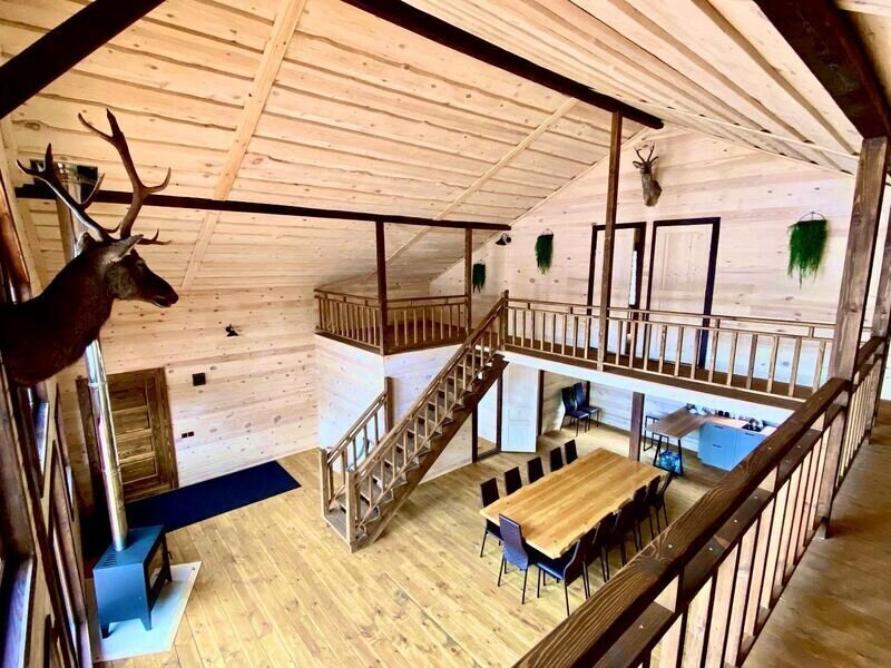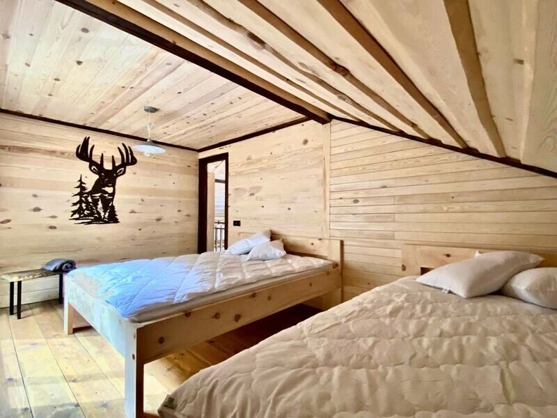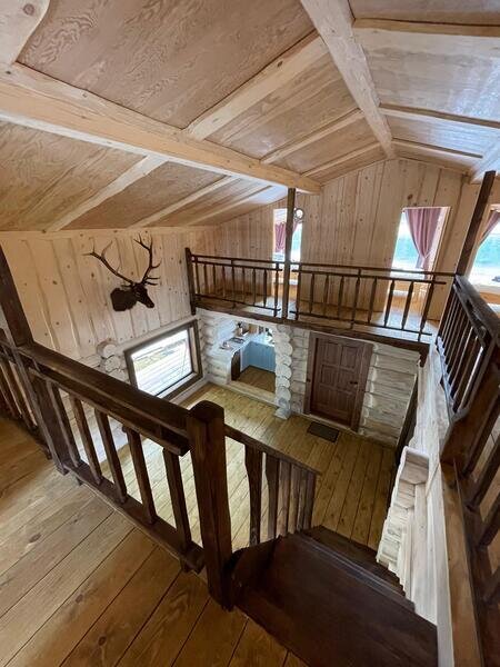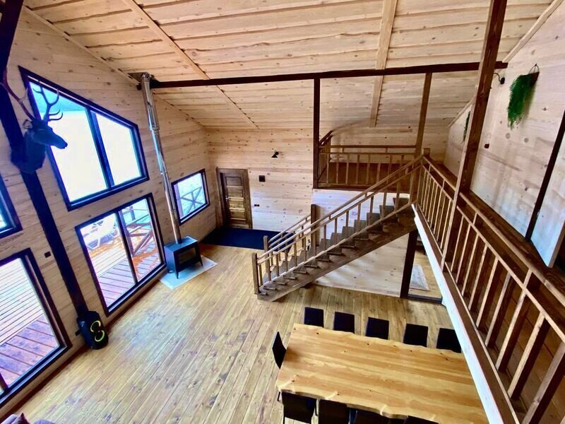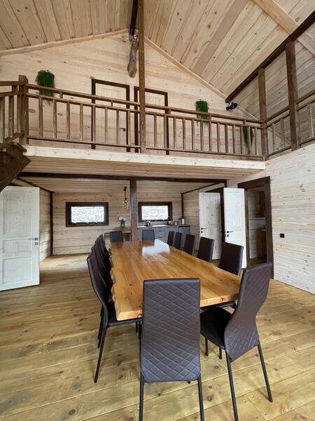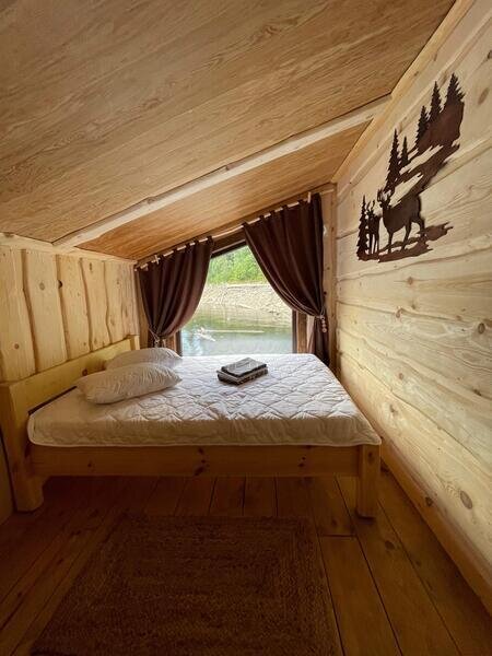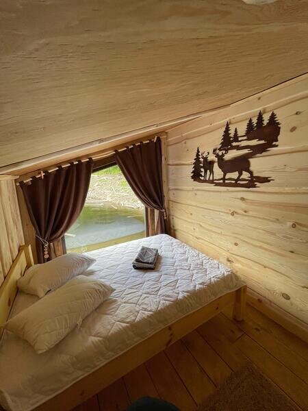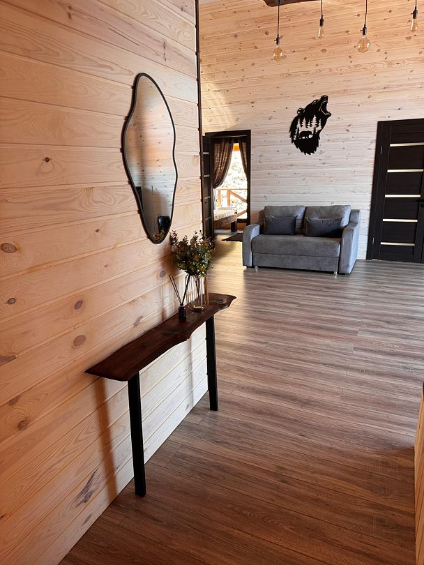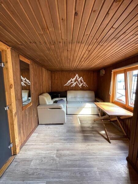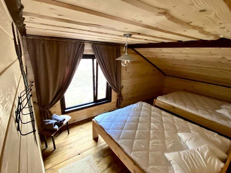 - уютными, большими спальными номерами с панорамными окнами в современном экологическом стиле (пять 2-х местных номеров, большой диван в гостиной). Итого 12 полноценных спальных мест;