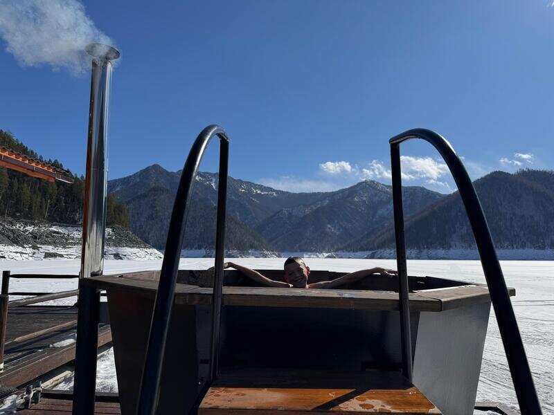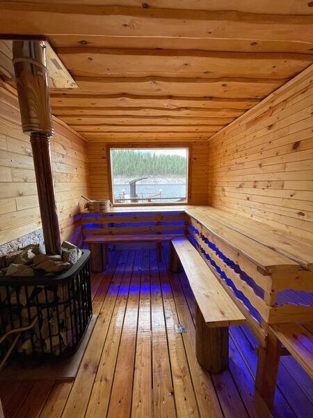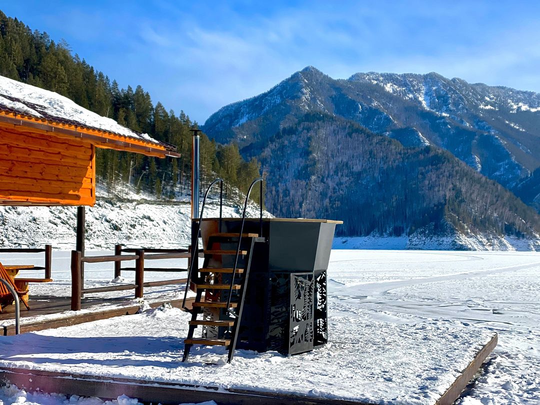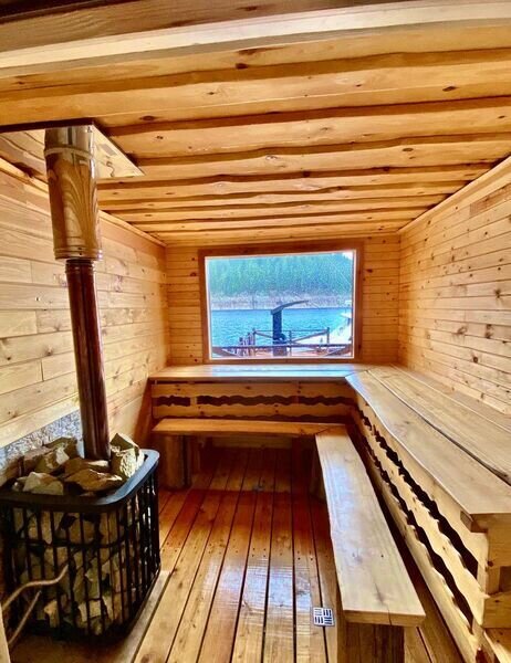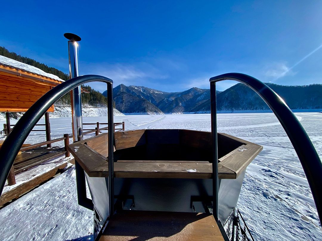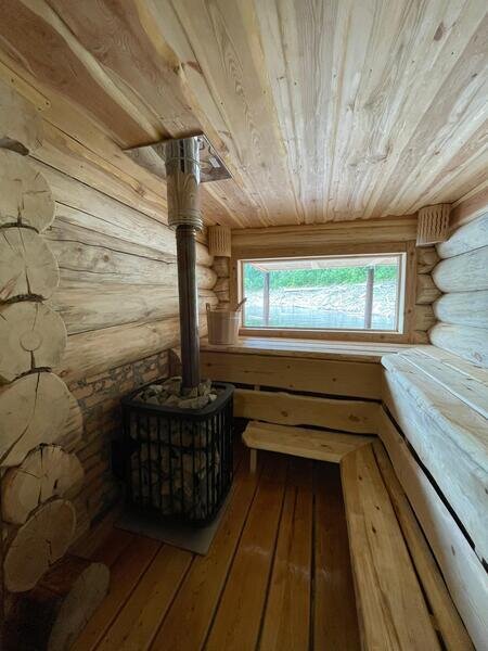 - большой, сибирской баней с панорамными видами из массива бруса на жадеитовых камнях с отдельным выходном в море;