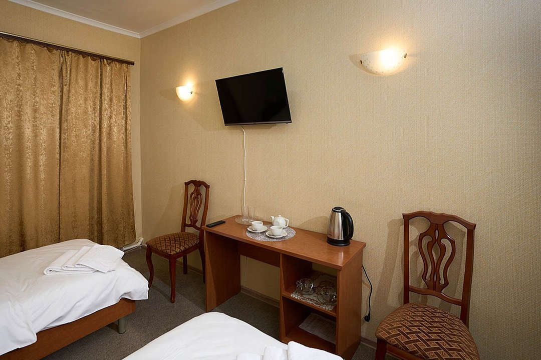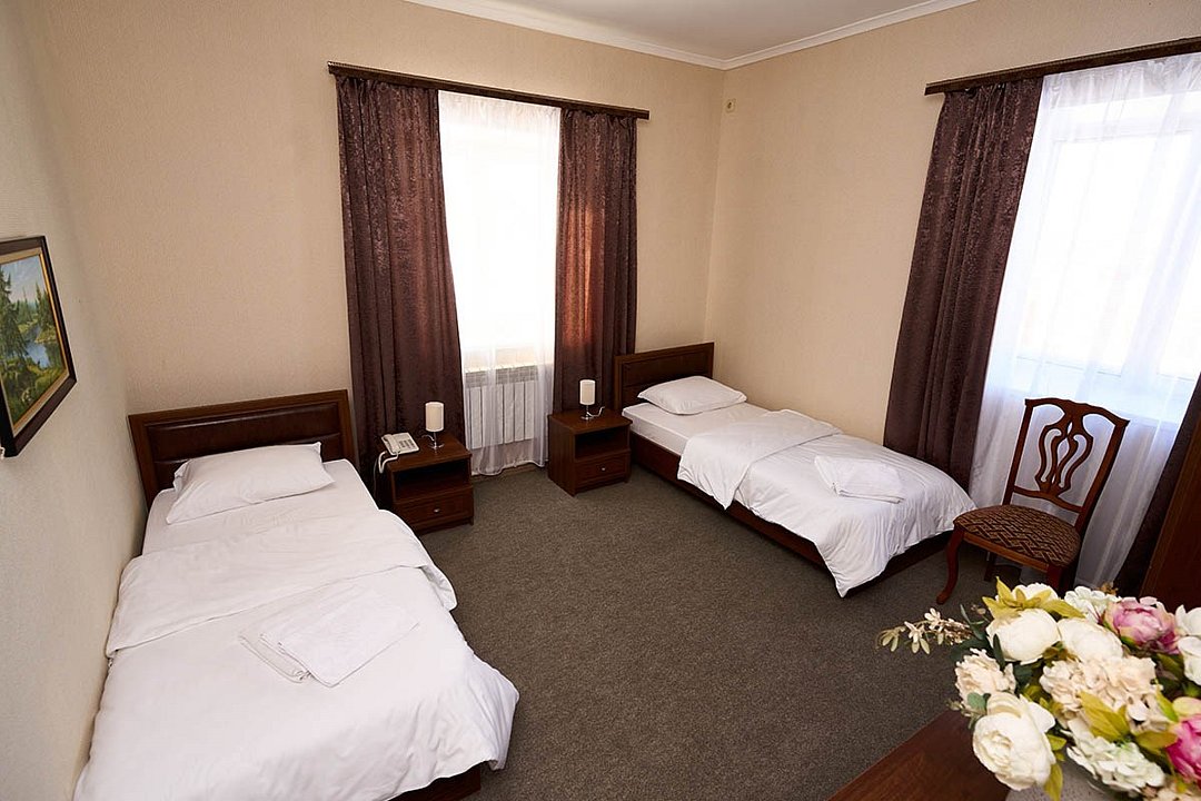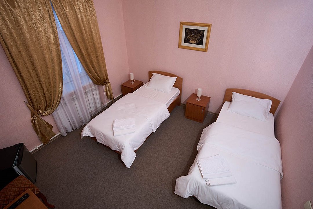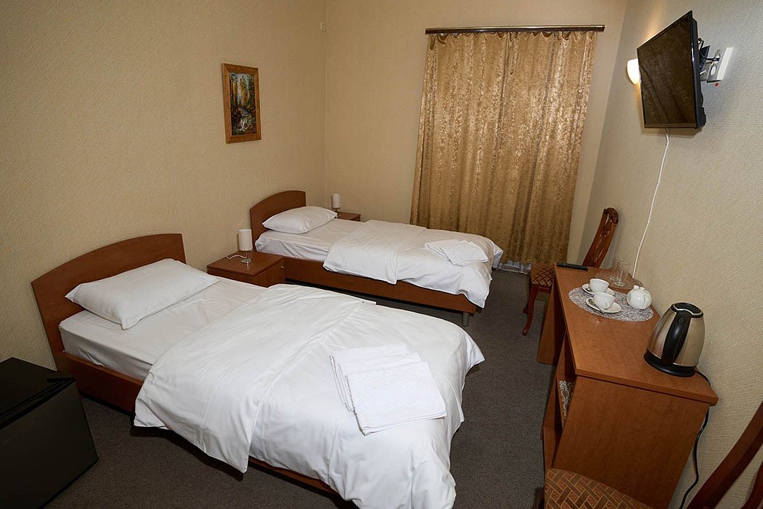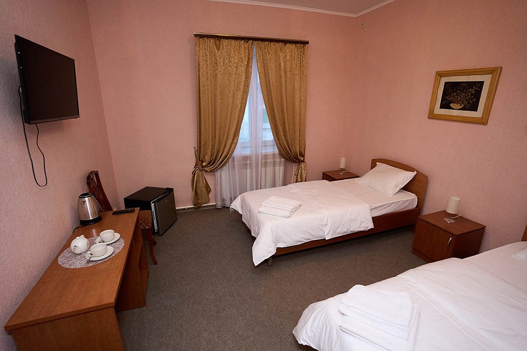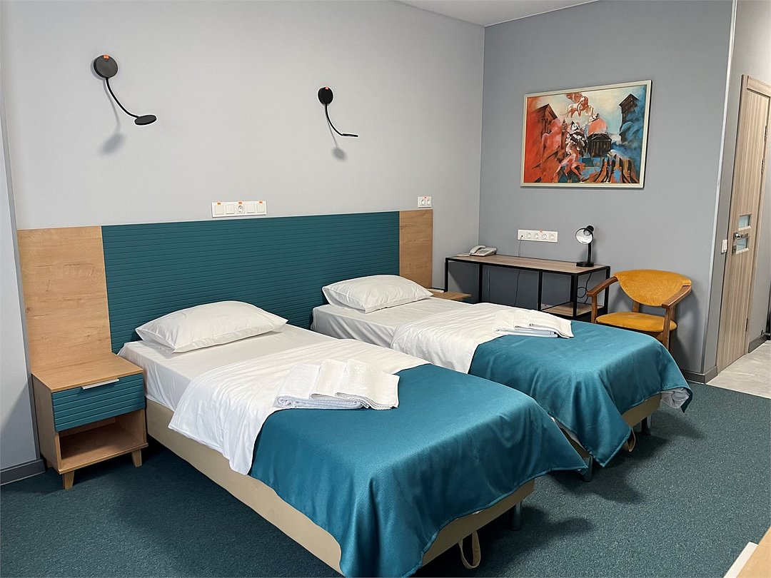 Двухместный стандартный номер, с двумя односпальными кроватями, в номере есть всё необходимое для комфортного отдыха: прикроватные тумбы, рабочий стол, стулья, настольная лампа, цифровое ТВ, Wi-Fi, телефон, мини холодильник, чайник, чайный набор. Ванная комната с душевой кабиной, укомплектована банными принадлежностями, феном, средствами личной гигиены, зубным набором, одноразовыми тапочкамиУслуги и удобства