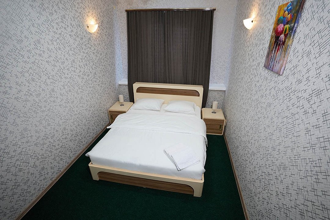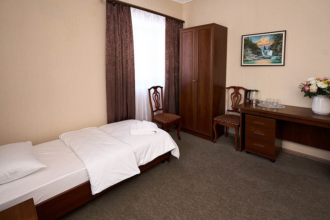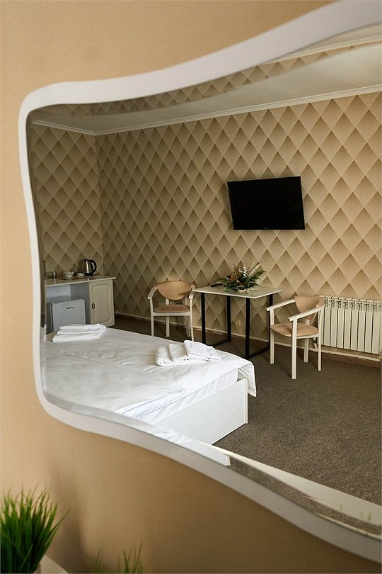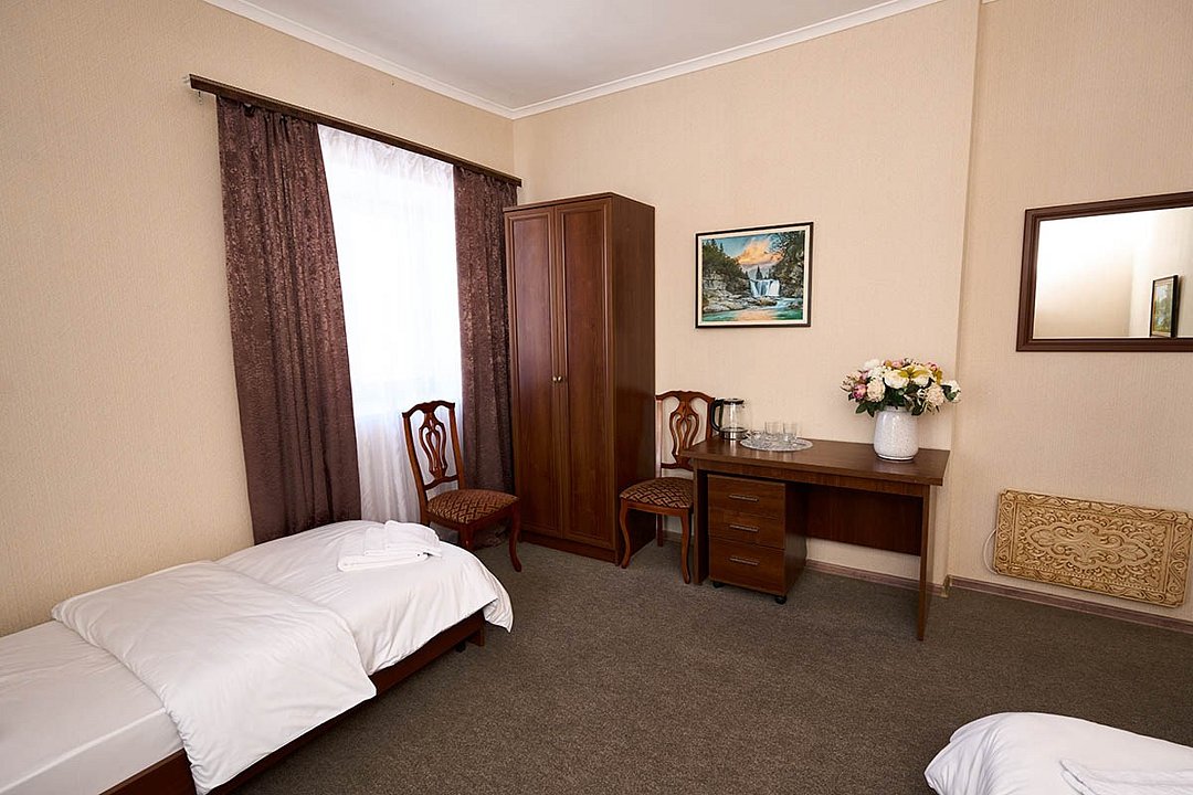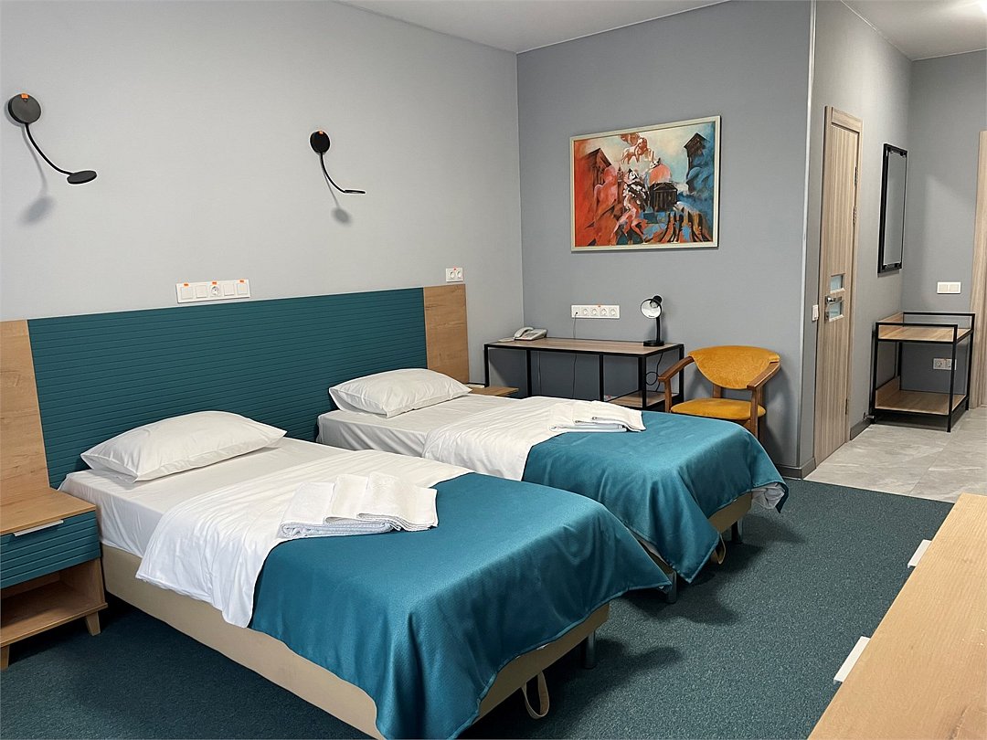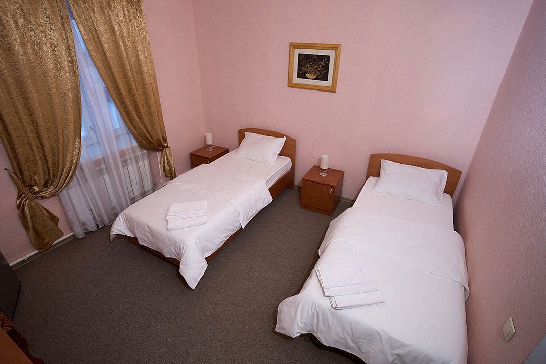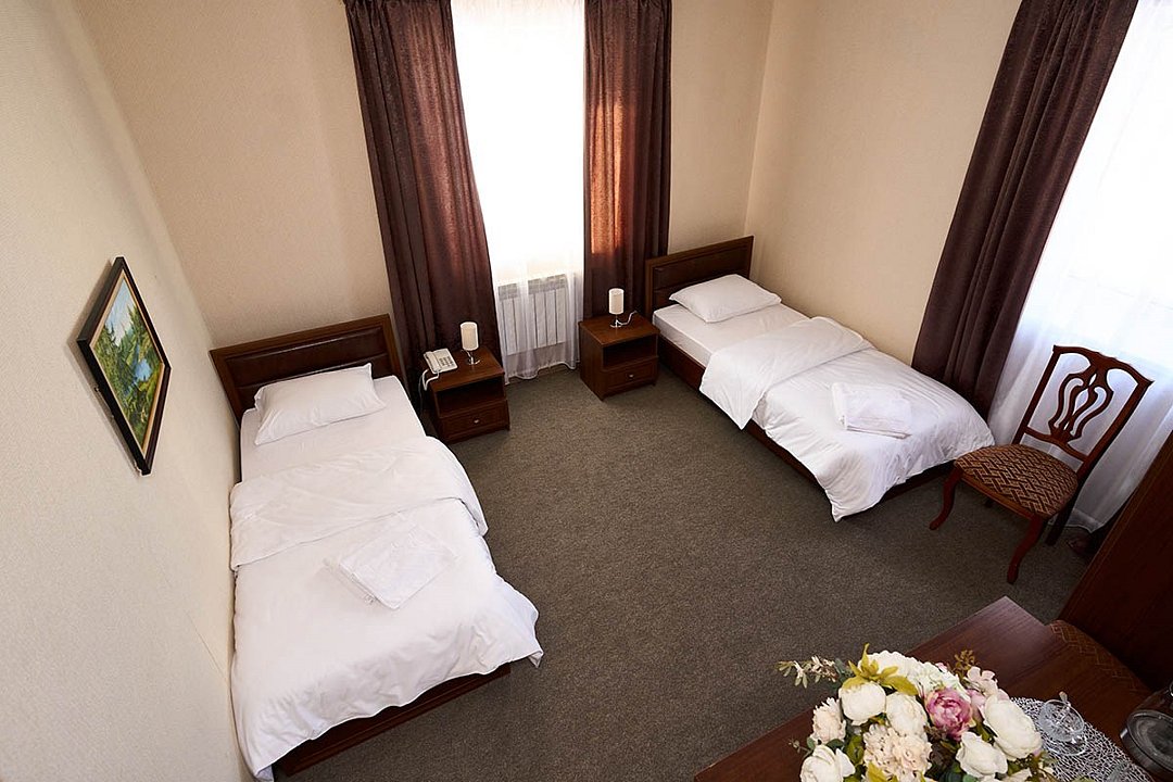 Двухместный стандартный номер, с двумя односпальными кроватями, в номере есть всё необходимое для комфортного отдыха: прикроватные тумбы, рабочий стол, стулья, настольная лампа, цифровое ТВ, Wi-Fi, телефон, мини холодильник, чайник, чайный набор. Ванная комната с душевой кабиной, укомплектована банными принадлежностями, феном, средствами личной гигиены, зубным набором, одноразовыми тапочкамиУслуги и удобства