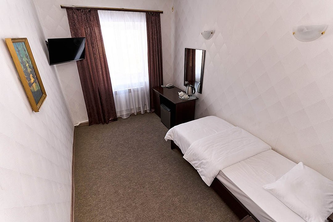 Номер состоит из одной комнаты с видом на реку КАМА, для проживания одного человека. В номере односпальная кровать, прикроватная тумба, рабочий стол, лампа цифровое ТВ, Wi-Fi, телефон, мини холодильник, чайник, чайный набор. Ванная комната с душевой кабиной, укомплектована банными принадлежностями, феном, средствами личной гигиены, зубным набором, одноразовыми тапочками.Услуги и удобства