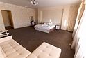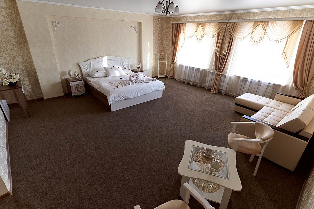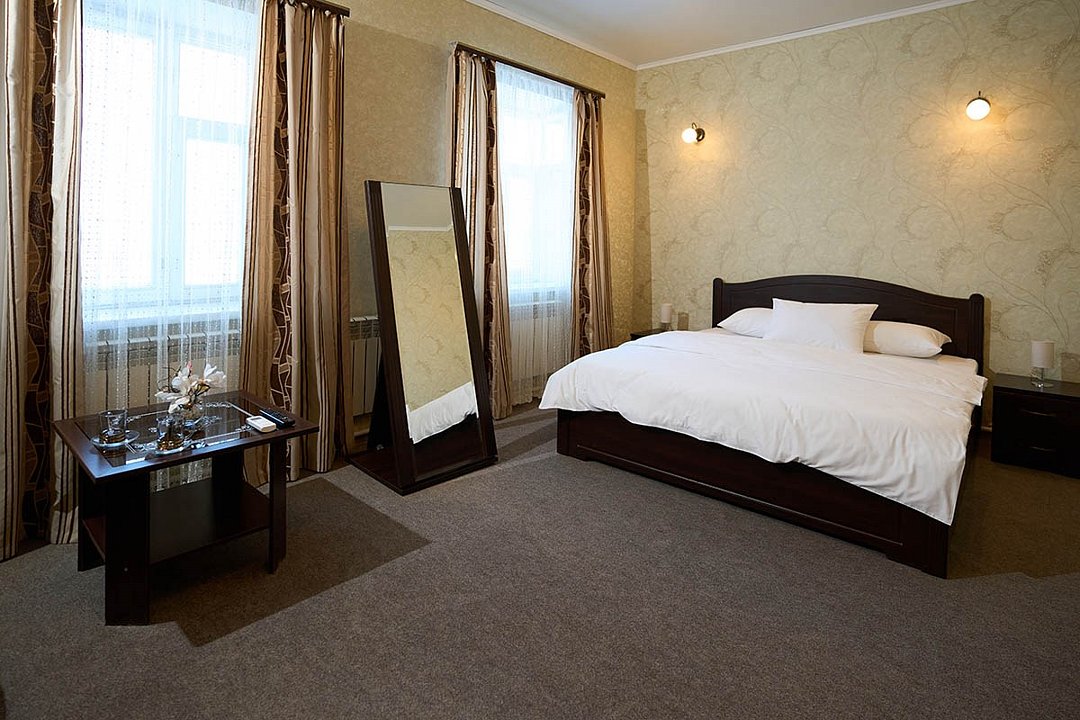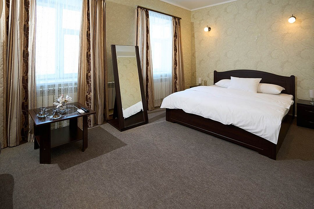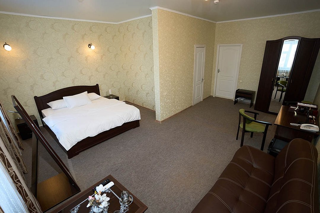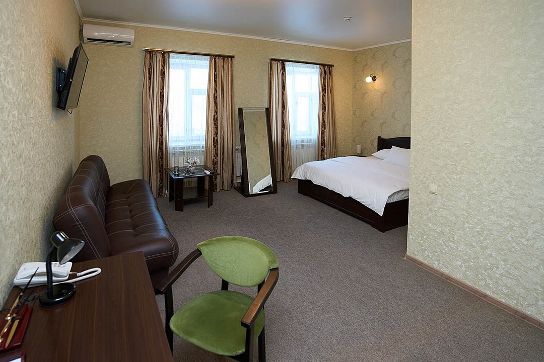 Просторный гостиничный номер 50 кв.м. состоит из одной комнаты, для проживания от одного до четырёх гостей, King Size Bed 180*200 двуспальная кровать, диван раскладной, меню подушек, прикроватные тумбы, туалетный и кофейный столики, стол, стулья, шкаф для одежды, цифровое ТV, телефон, мини холодильник, чайник, чайный набор. Ванная комната оборудована ванной с джакузи, укомплектована махровым и вафельным халатами, банными принадлежностями, феном, средствами личной гигиены, зубным набором, одноразовыми тапочками.Услуги и удобства