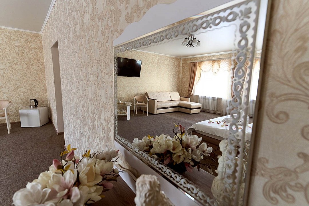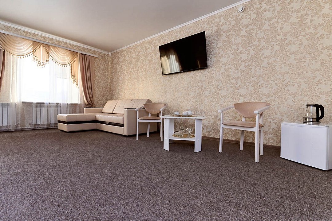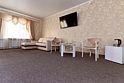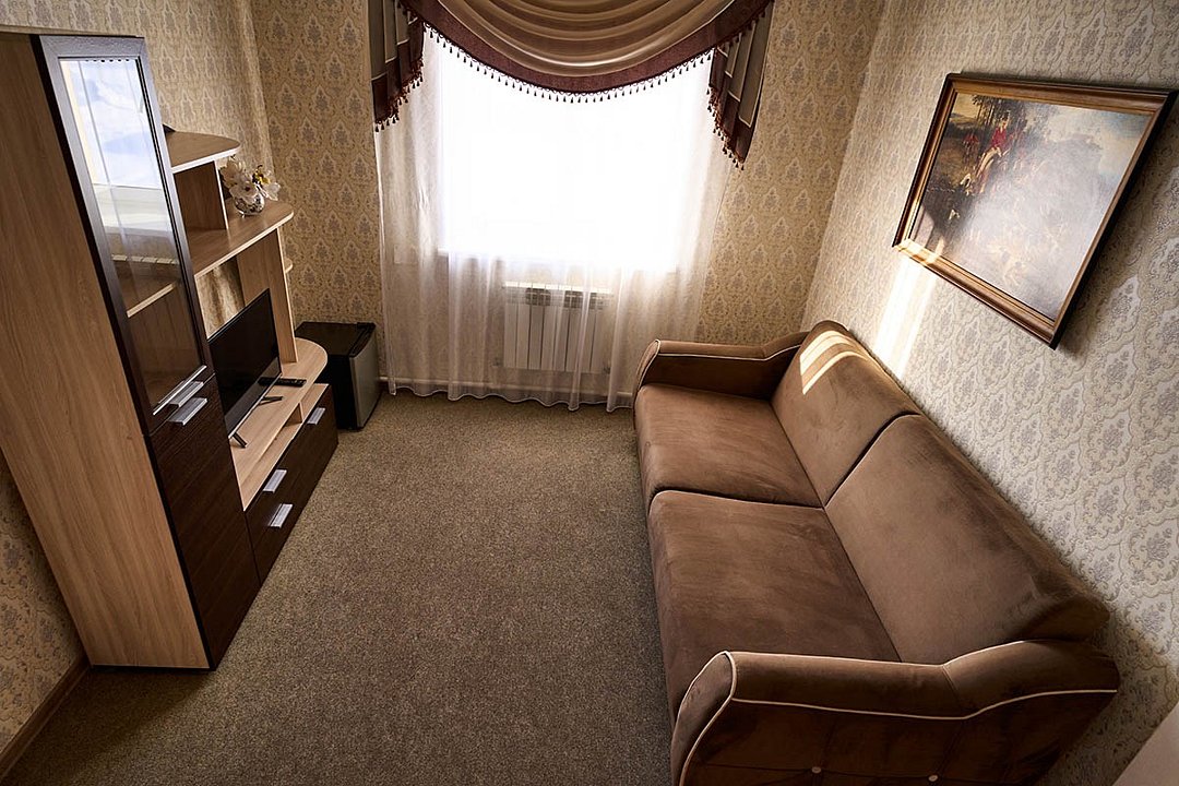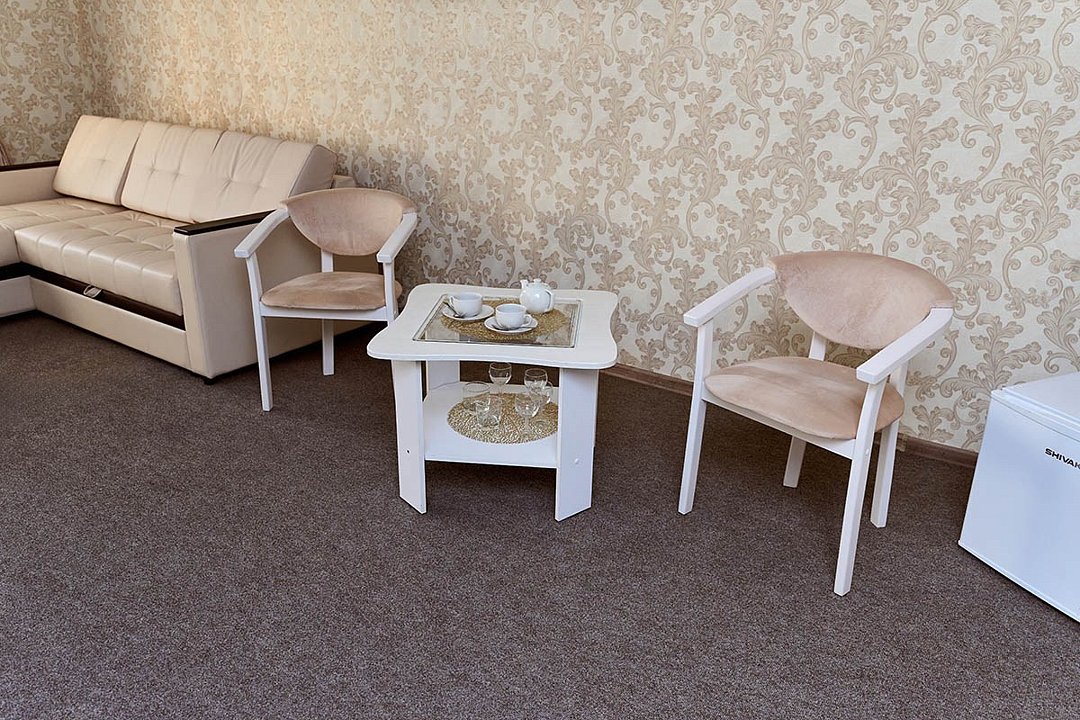 Номер состоит из двух комнат для проживания от одного до четырех гостей. В гостиной расположен диван раскладной, цифровое ТV, стенка-горка, мини холодильник. Спальная комната: 2 односпальные кровати, прикроватные тумбы, стол, стулья, шкаф для одежды, цифровое TV, телефон, чайник, чайный набор. Ванная комната оборудована ванной, феном, банными принадлежностями, средствами личной гигиены, зубным набором, одноразовыми тапочками.Услуги и удобства