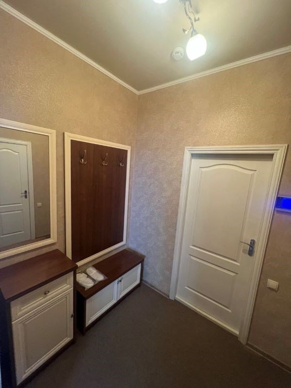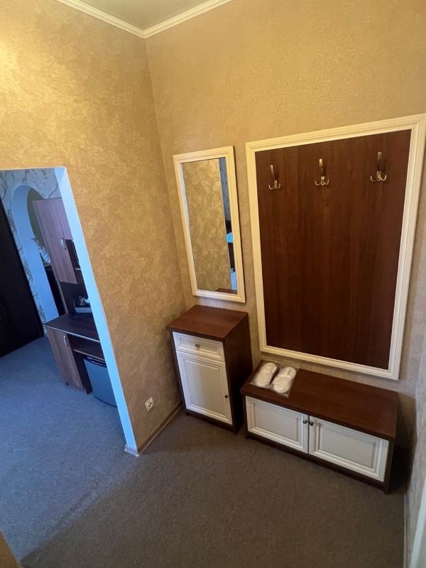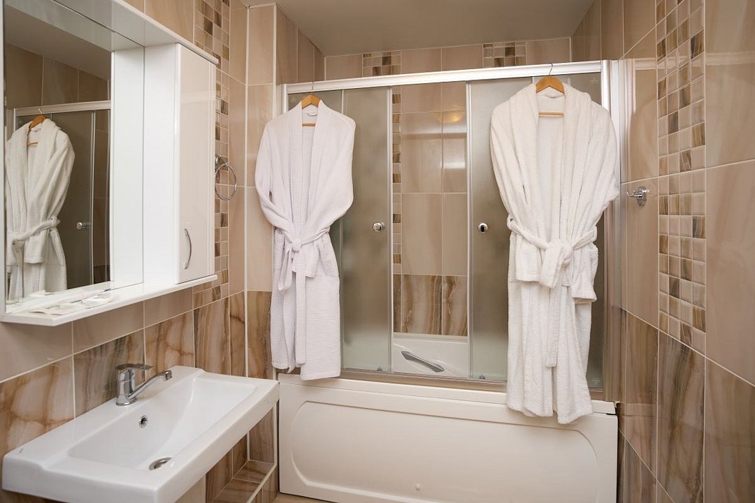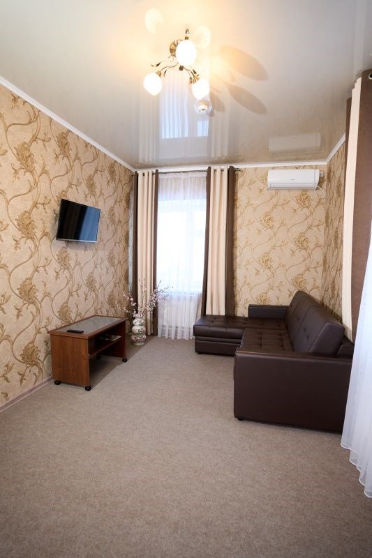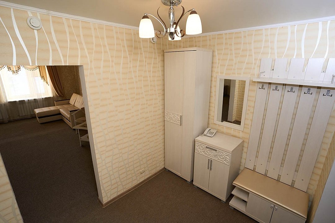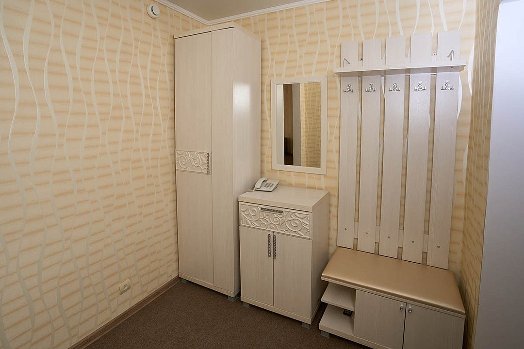 Номер состоит из двух комнат для проживания от одного до четырех гостей. В гостиной расположен диван раскладной, цифровое ТV, стенка-горка, мини холодильник. Спальная комната: 2 односпальные кровати, прикроватные тумбы, стол, стулья, шкаф для одежды, цифровое TV, телефон, чайник, чайный набор. Ванная комната оборудована ванной, феном, банными принадлежностями, средствами личной гигиены, зубным набором, одноразовыми тапочками.Услуги и удобства