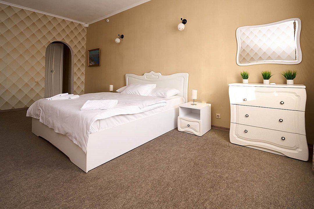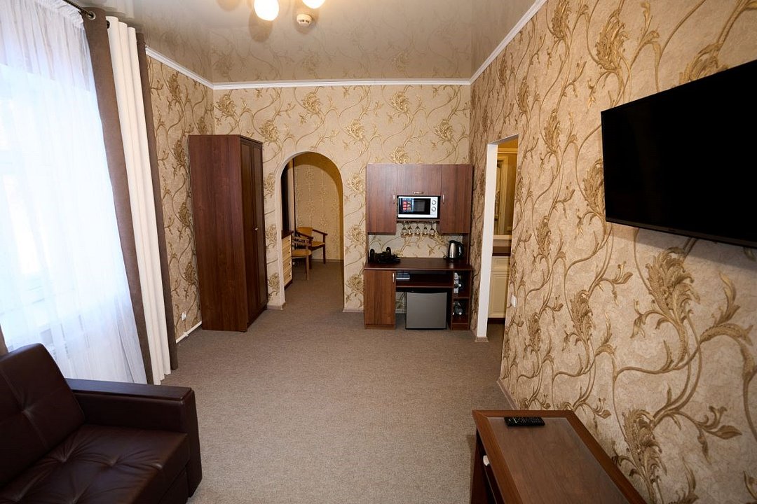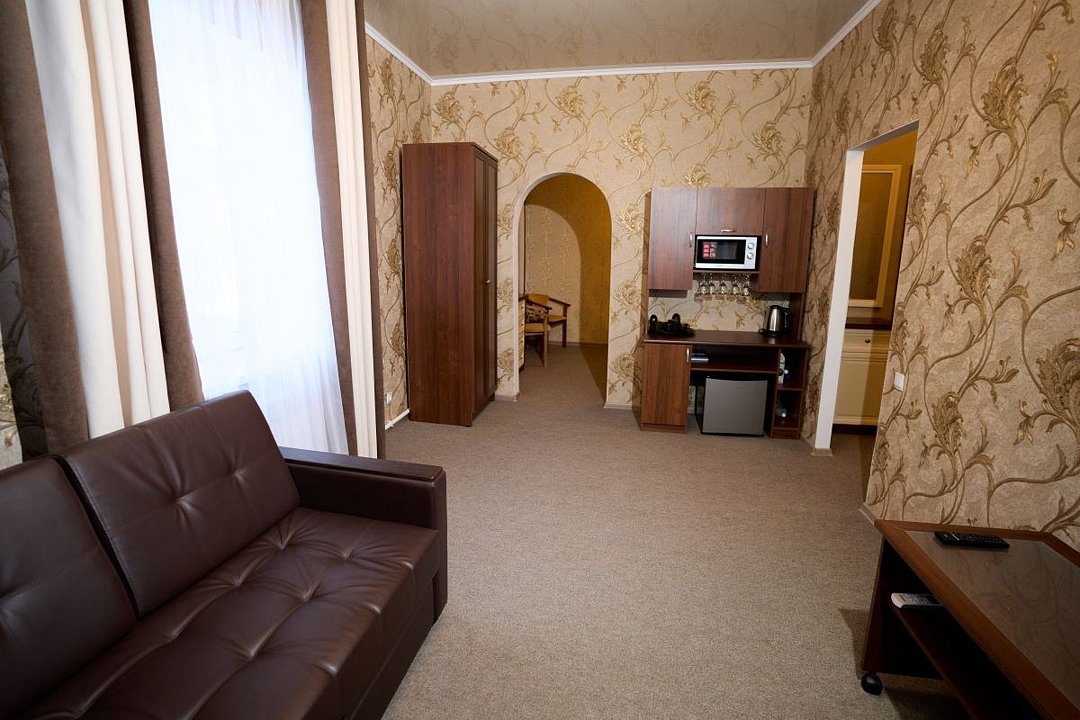 Просторный двухкомнатный номер 40 кв.м. со спальной и гостевой зоной оборудованной мини-кухней с микроволновой печью, для проживания от одного до четырёх гостей, Queen Size Bed 160*200 двуспальная кровать, диван раскладной, меню подушек, прикроватные тумбы, комод и кофейный столик, стулья, шкаф для одежды, цифровое ТV, телефон, мини холодильник, чайник, чайный набор. Ванная комната оборудована ванной, укомплектована махровым и вафельным халатами, банными принадлежностями, феном, средствами личной гигиены, зубным набором, одноразовыми тапочками.Услуги и удобства