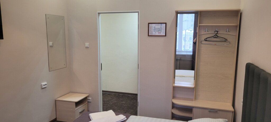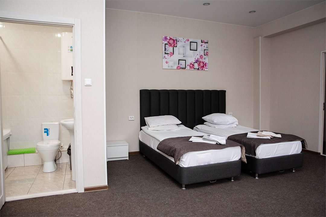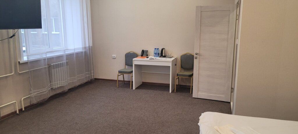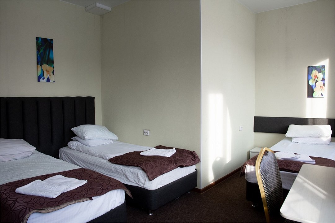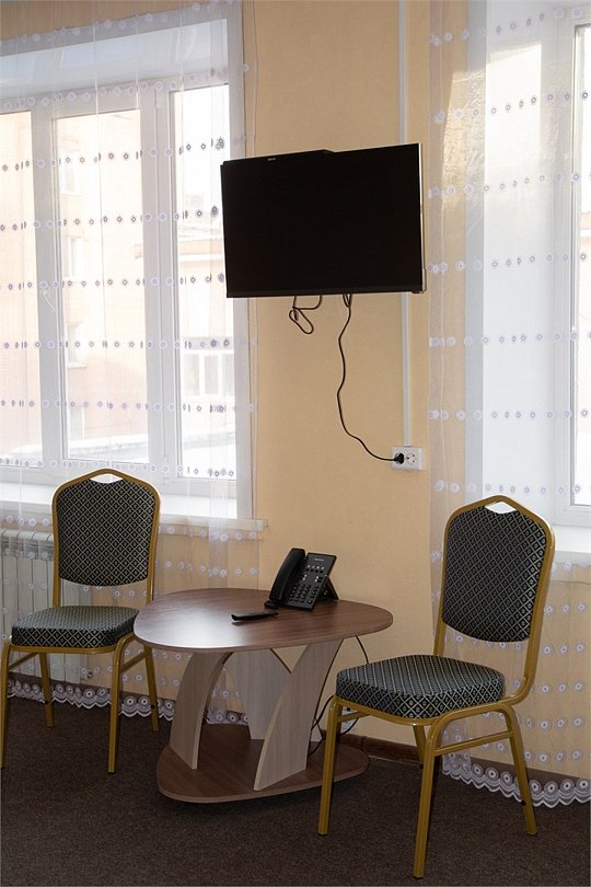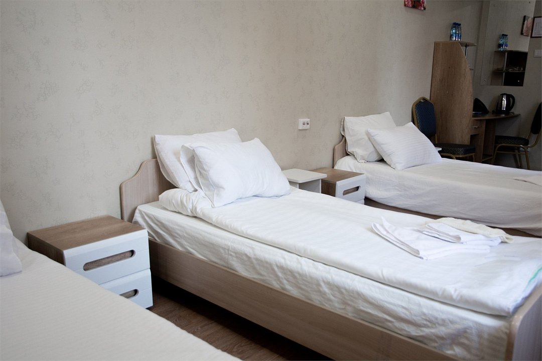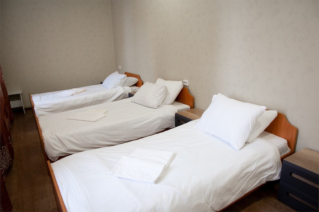Две кровати, стол, стул, тумбочка, телевизор, душевая кабина/ванна, туалет, раковина, Wi-Fi, чайник, фен, туалетные принадлежности, телефон. Пассажирский лифт для гостей. Завтрак включен.Номер 5 категория, 3-местный