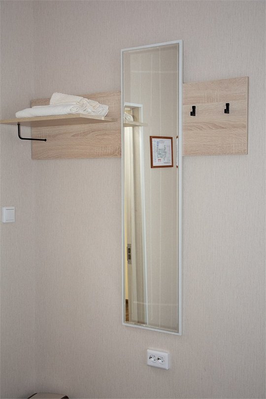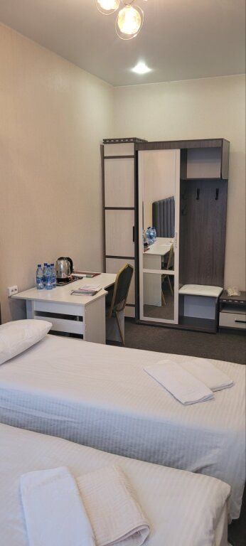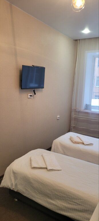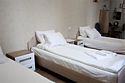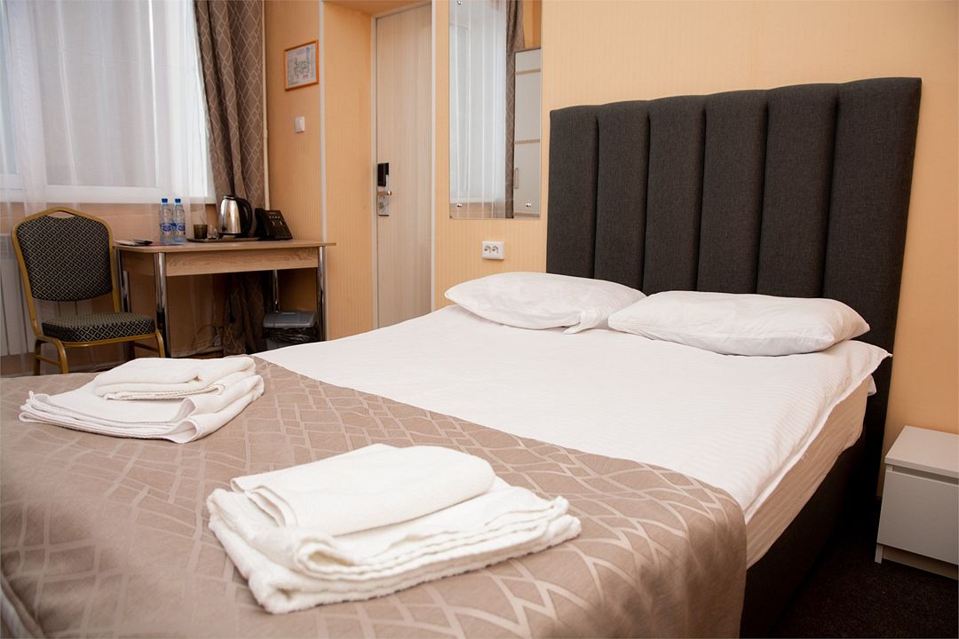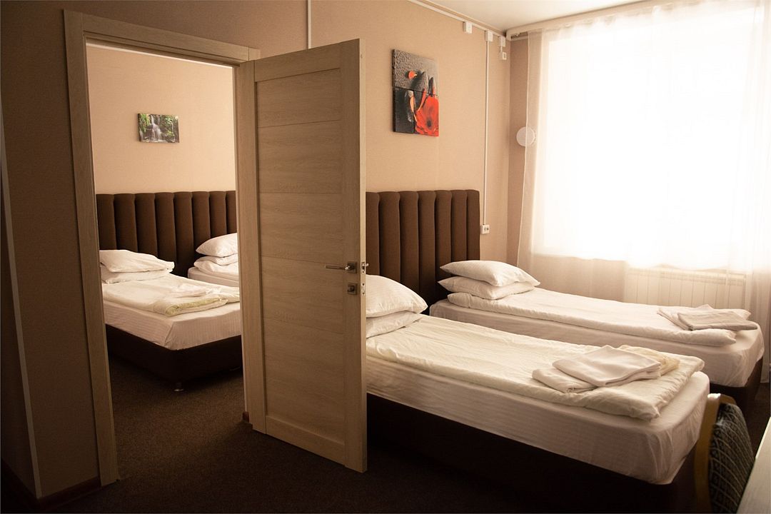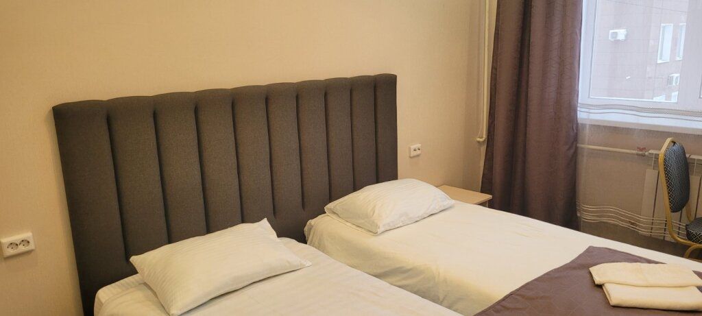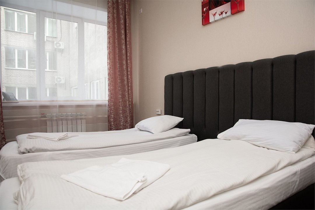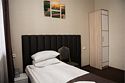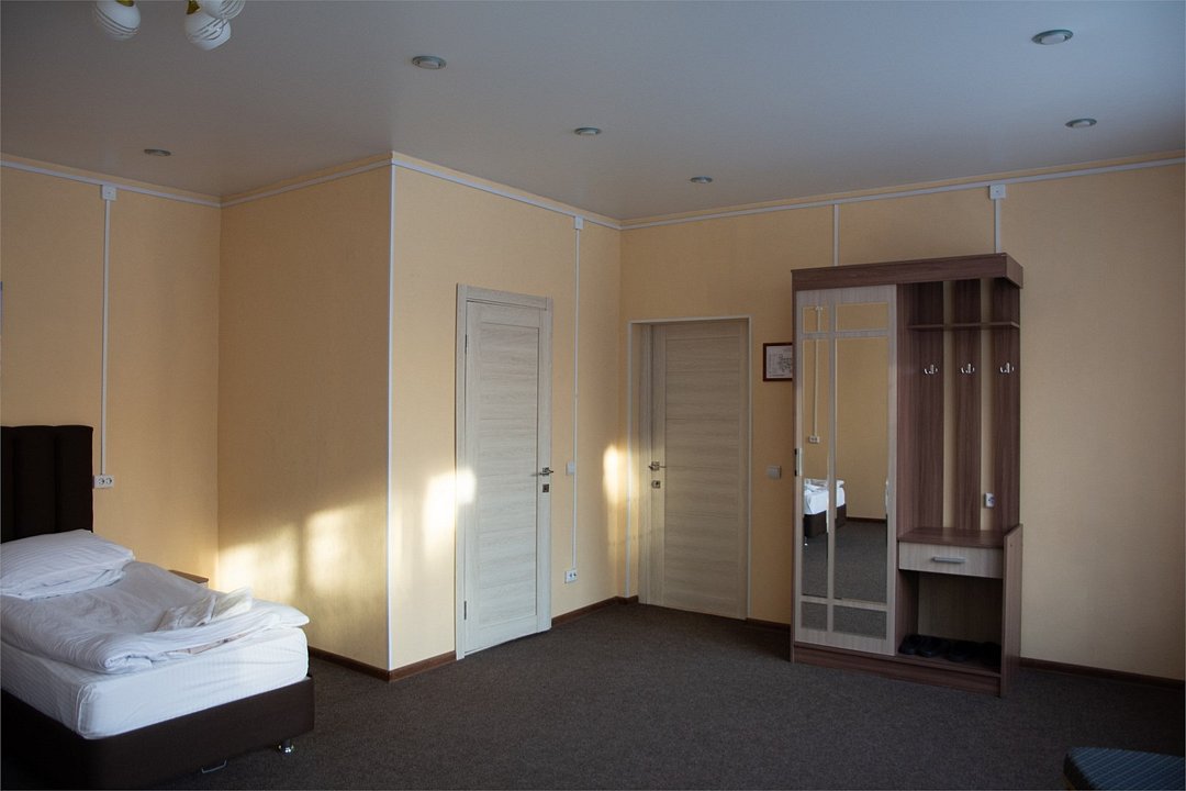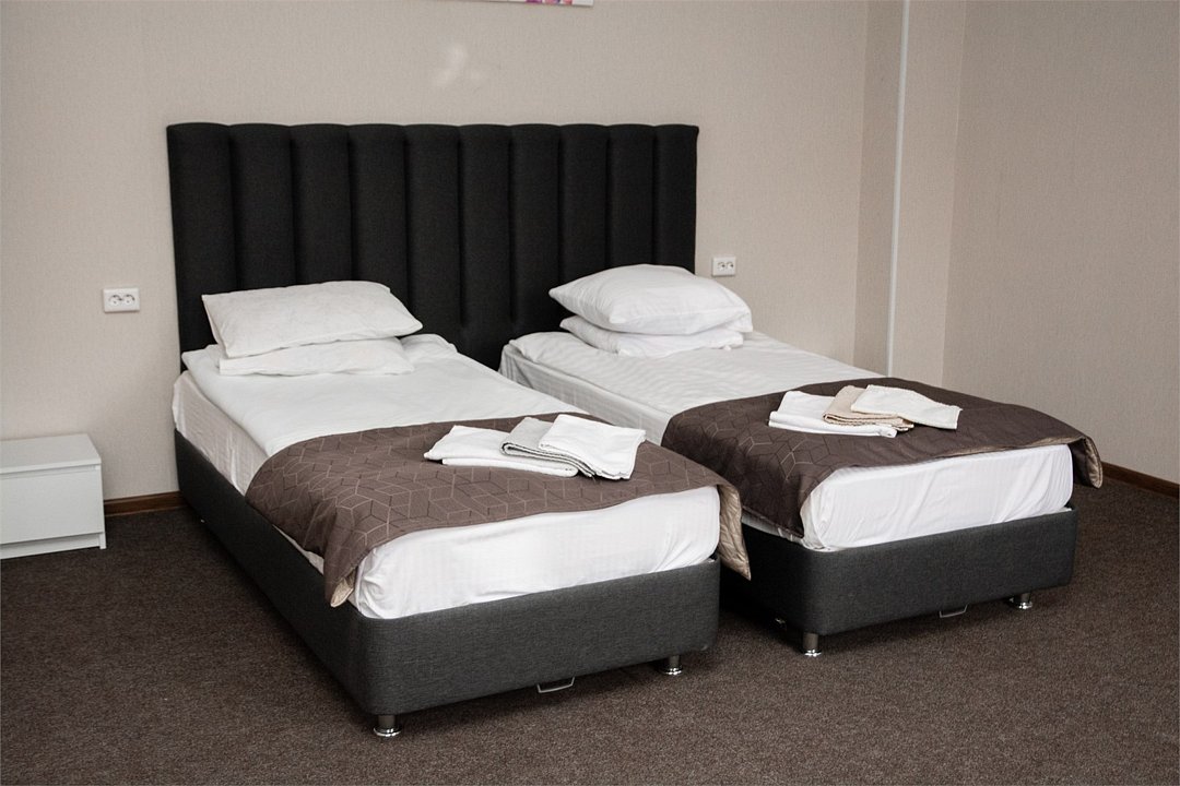 Две кровати, стол, стул, тумбочка, телевизор, душевая кабина/ванна, туалет, раковина, Wi-Fi, чайник, фен, туалетные принадлежности, телефон. Пассажирский лифт для гостей. Завтрак включен.Номер 5 категория, 3-местный