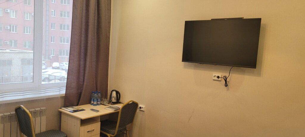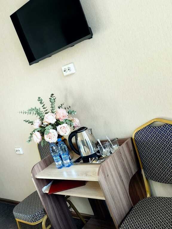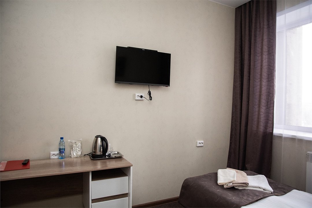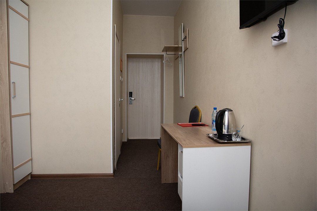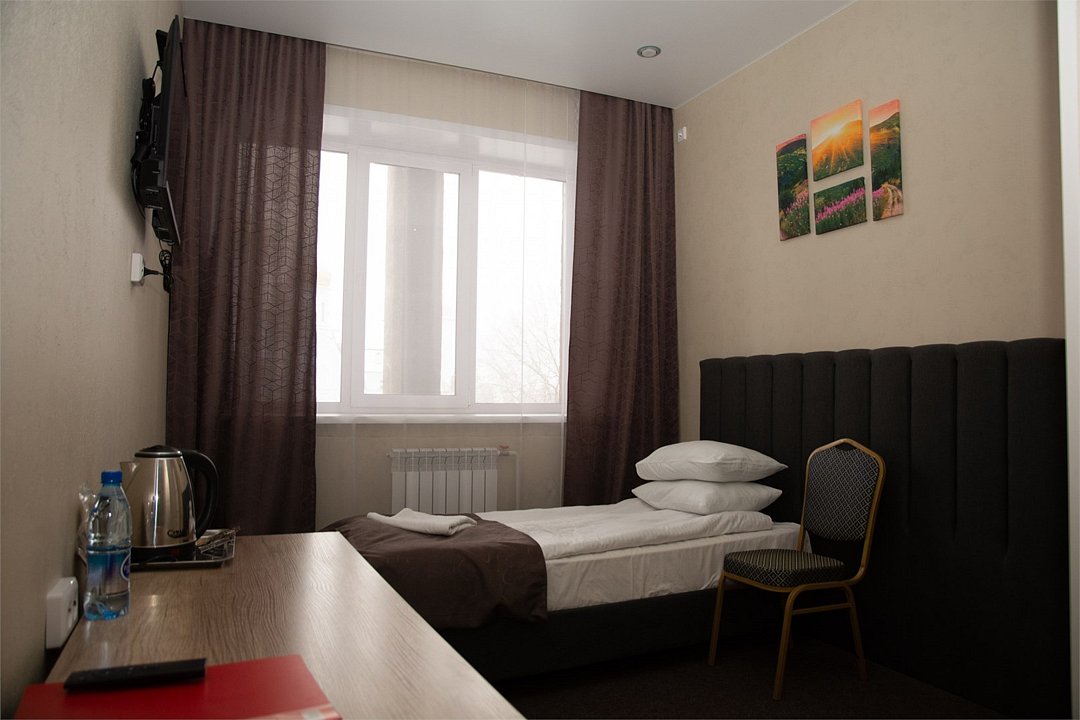 Одна кровать, стол, стул, тумбочка, телевизор, Wi-Fi, чайник, туалетные принадлежности, телефон. Санузел и ванная комната находятся на этаже. Пассажирский лифт для гостей. Завтрак включен.Услуги и удобства