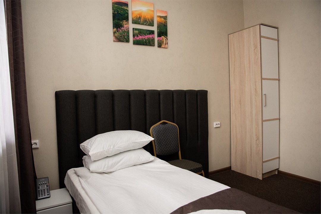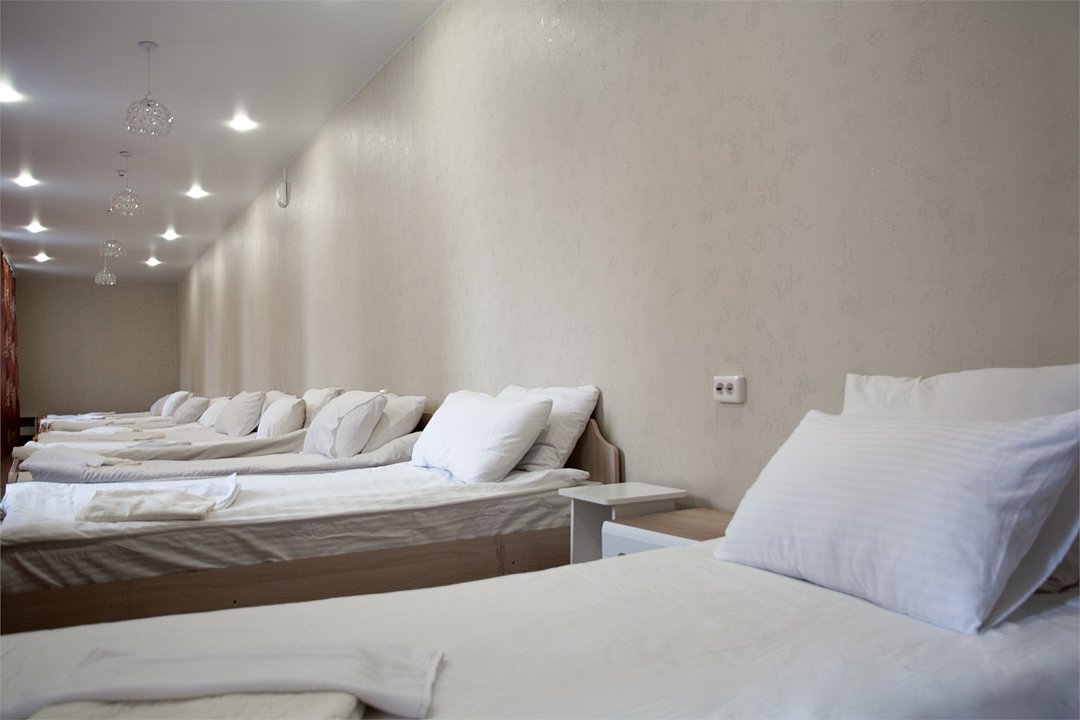 Одна кровать, стол, стул, тумбочка, телевизор, душевая кабина/ванна, туалет, раковина, Wi-Fi, чайник, фен, туалетные принадлежности, телефон. Пассажирский лифт для гостей. Завтрак включен.Место эконом 10-местный номер