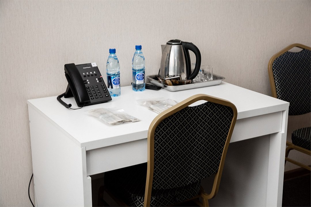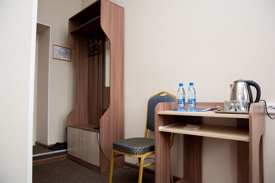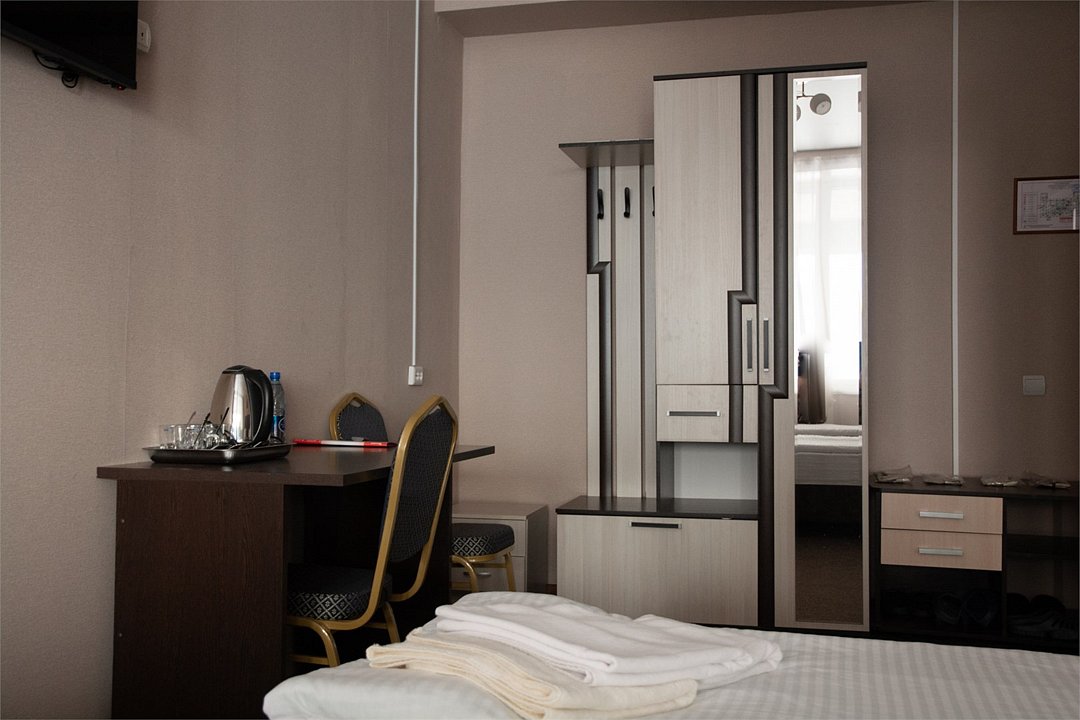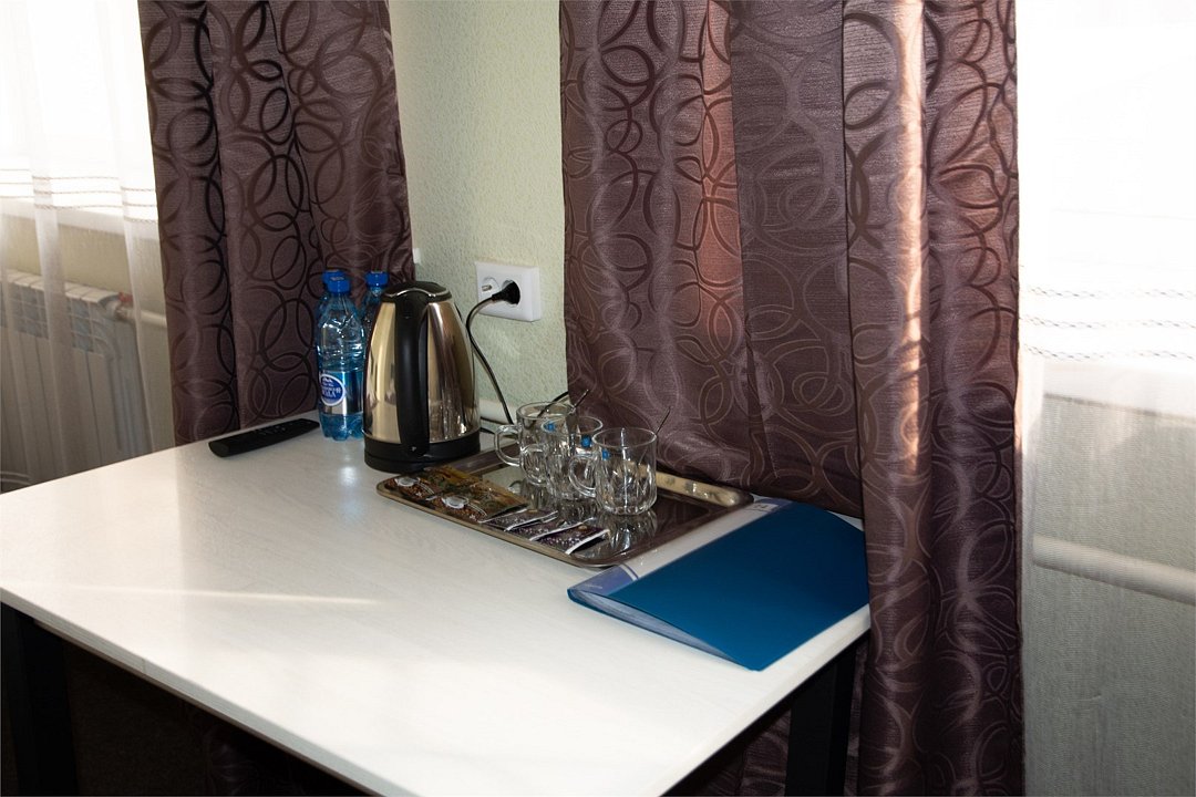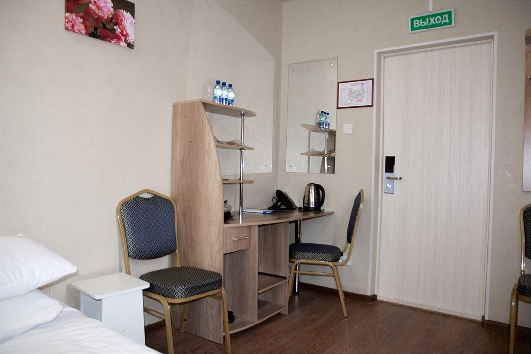 Гостиница занимает 2 и 3 этажи 6-этажного здания. Комфортабельные номера оснащены удобной мебелью, шкафами, телевизорами, Wi-Fi и собственными ванными комнатами с душевыми кабинами и туалетными принадлежностями. На территории отеля расположено кафе, где сервируются завтраки. Кулеры с горячей и холодной водой установлены на каждом этаже. Также имеется гладильная комната.