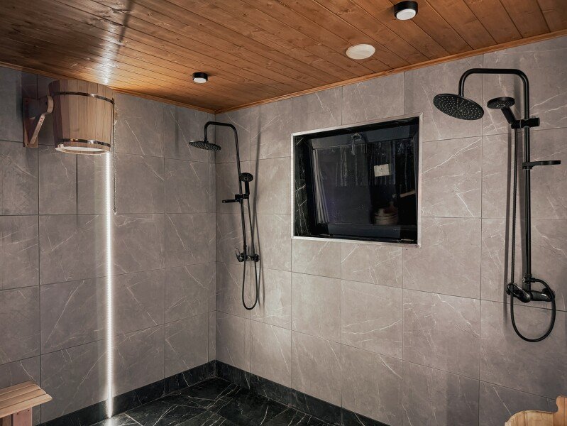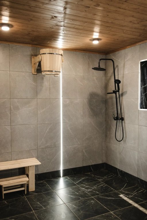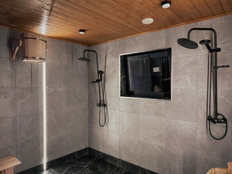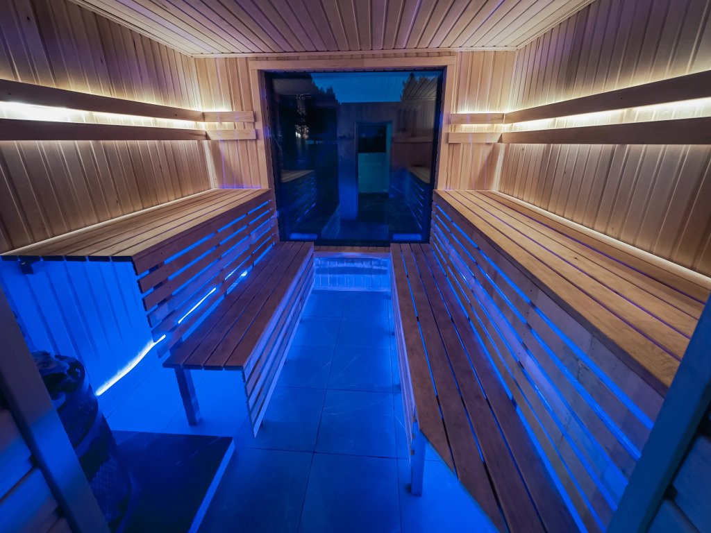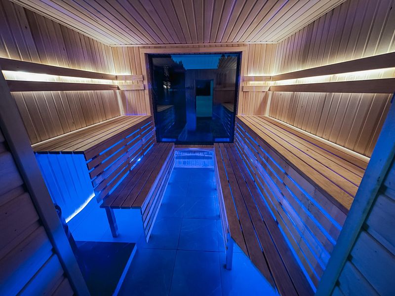 Инфраструктура: зона отдыха, полотенца, душСтильная современная баня с деревянной отделкой с панорамным окном. Идеально для отдыха на природе с парными процедурами и видами на закат.