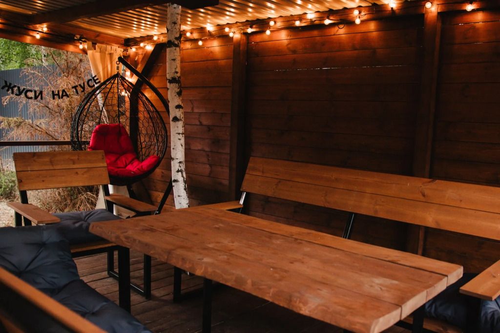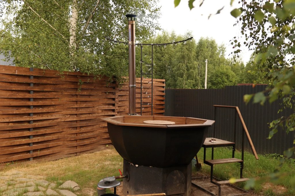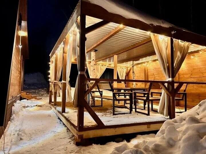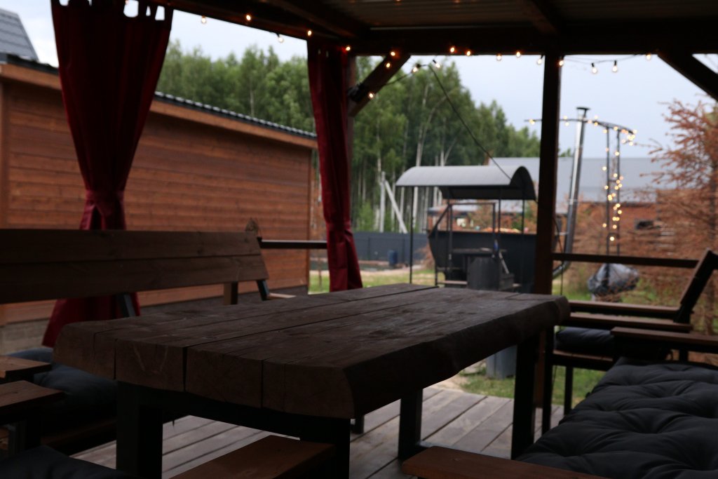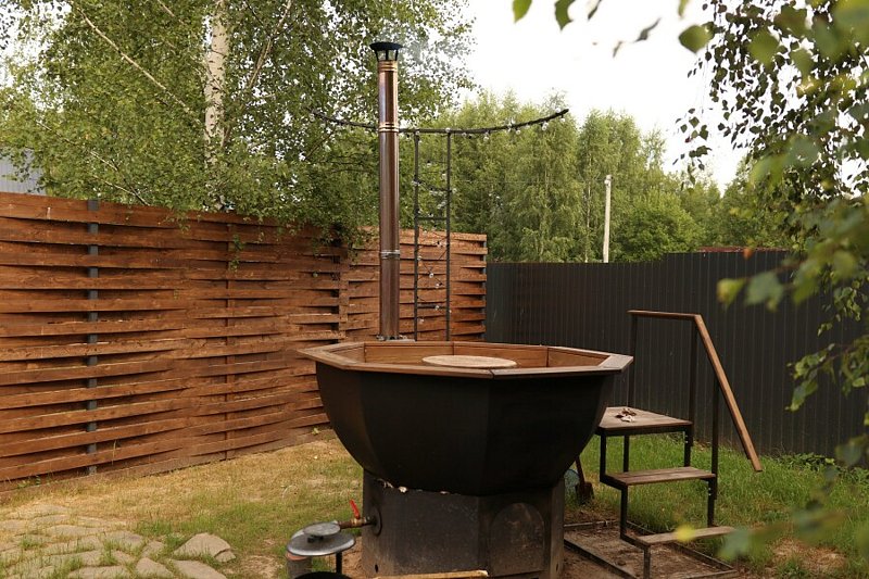 У каждого дома есть своя приватная территория и чан с мини-бассейном для летнего отдыха. Также вы можете посетить уютную баньку и отдохнуть на свежем воздухе в беседке.