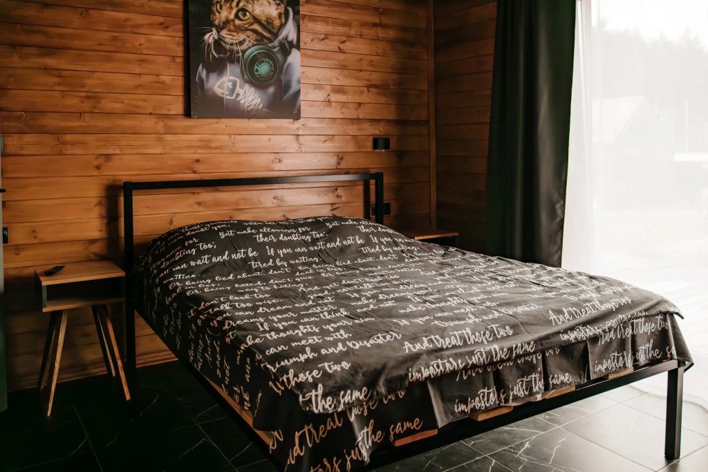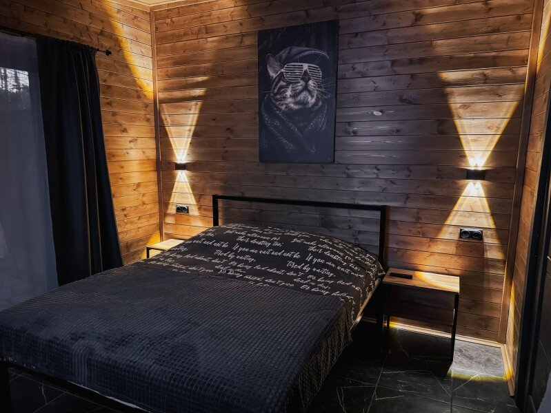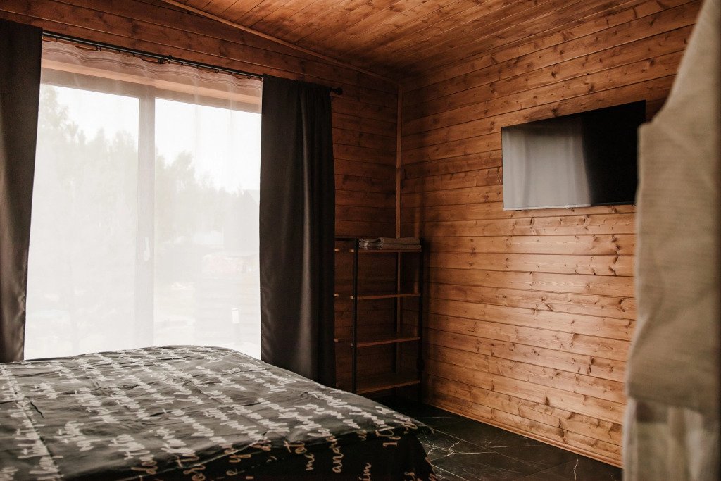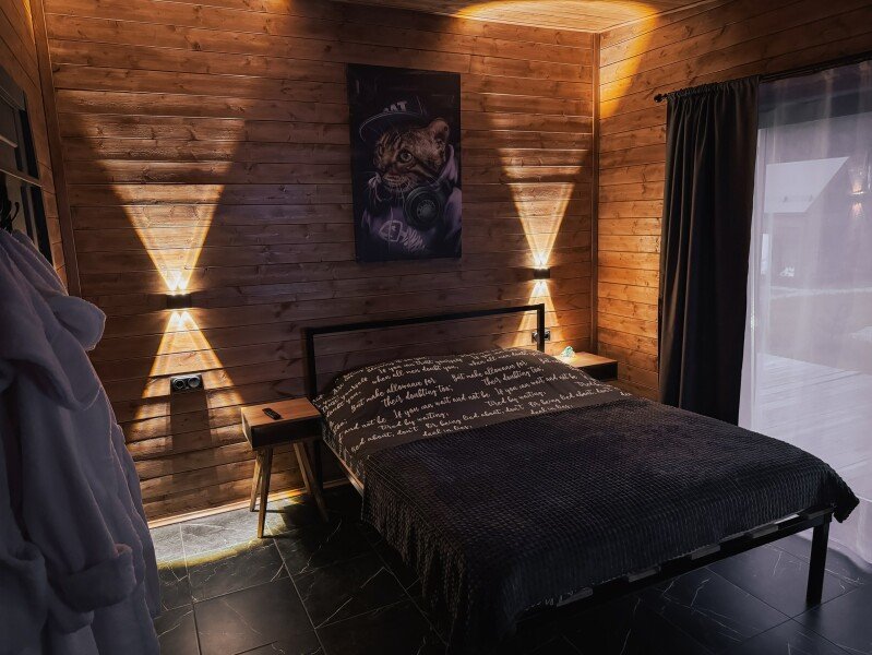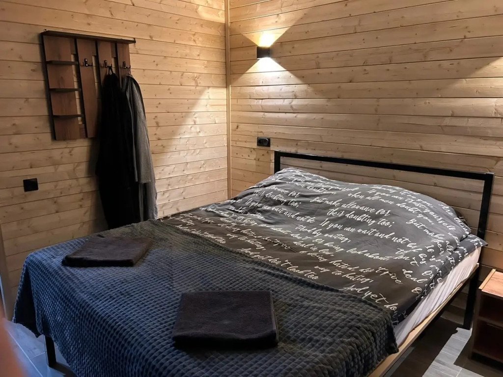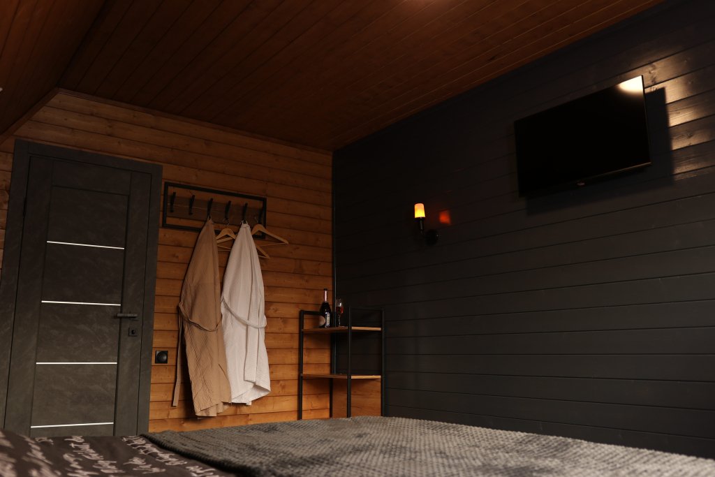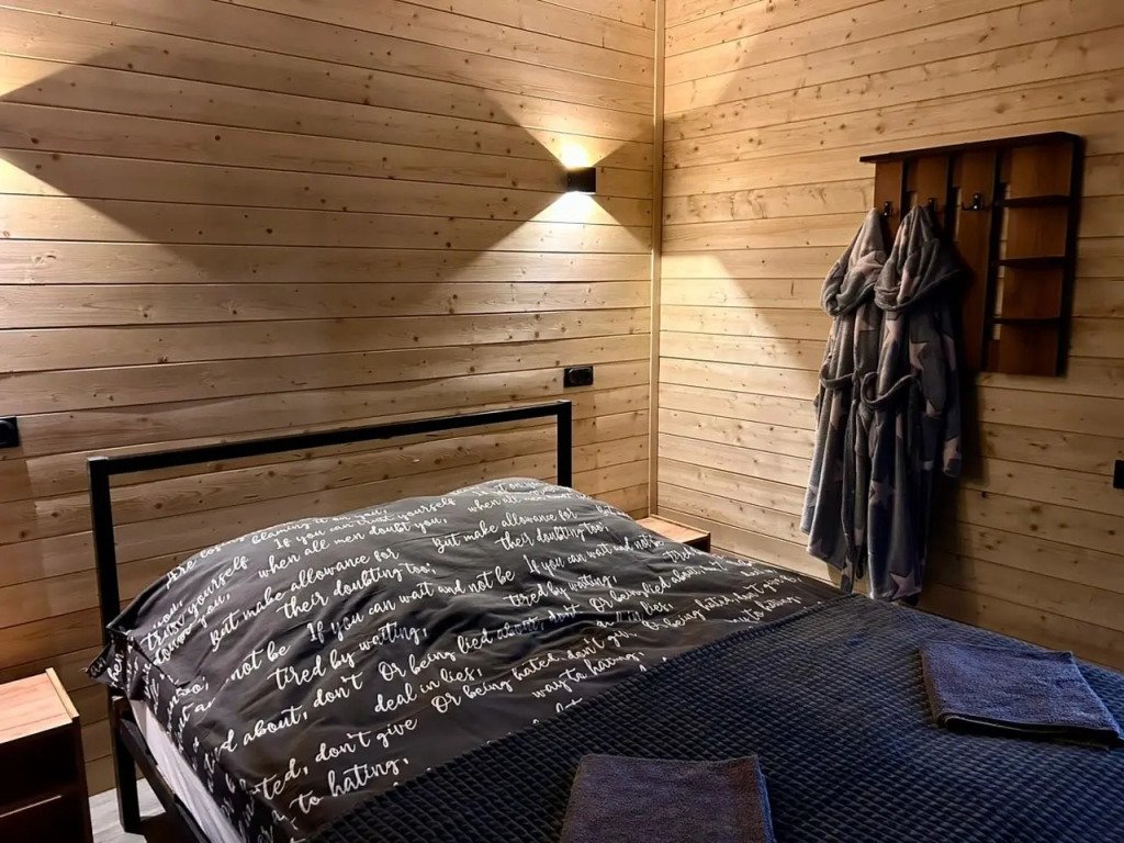 В каждом доме установлены удобные кровати с ортопедическими матрасами, индивидуальные тумбочки и шкафы для одежды. Предоставляется полный комплект постельного белья, включая халаты. Кухня оснащена всем необходимым. Зона отдыха включает удобный диван и телевизор. Ванные комнаты светлые и просторные, есть отдельный туалет и стиральная машина. Также доступен Wi-Fi.