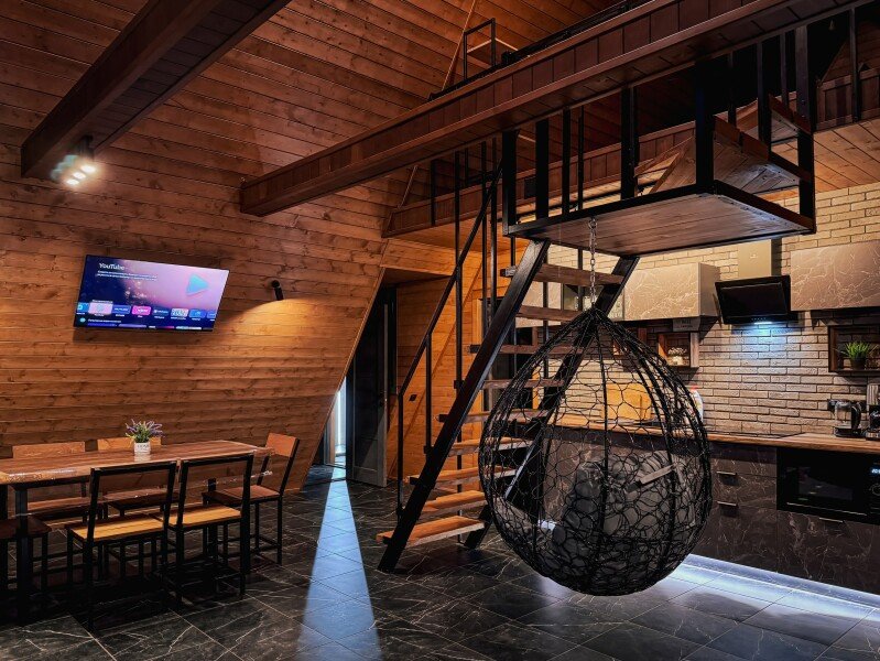- просторная гостиная с диваном, столом и качелью-гнездом;