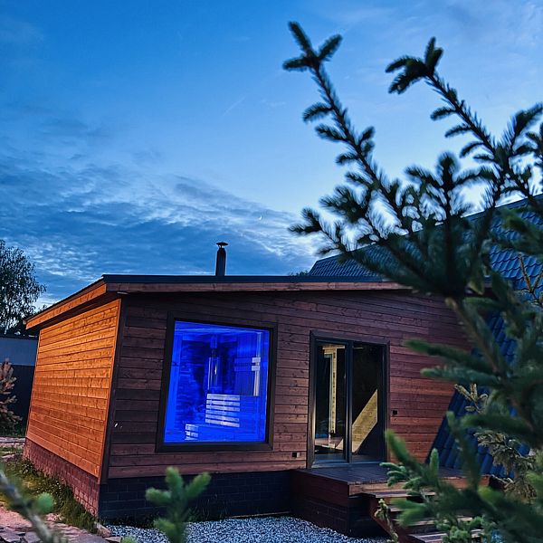 Стильная современная баня с деревянной отделкой с панорамным окном. Идеально для отдыха на природе с парными процедурами и видами на закат.
