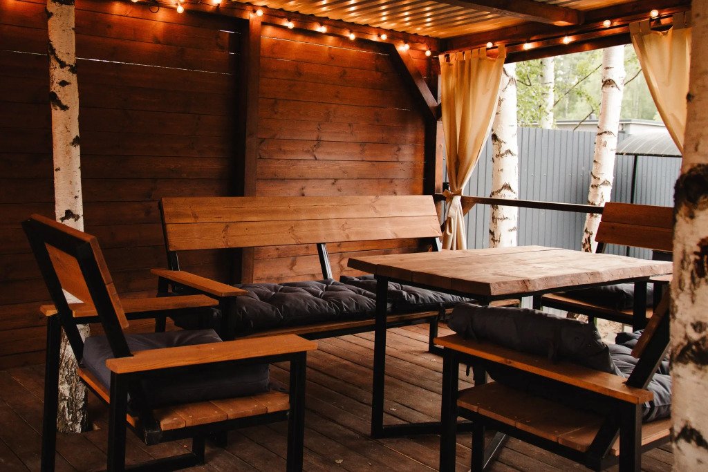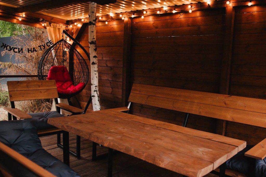 Уютная беседка площадью 30 м² с прямым выходом из дома — идеальное место для отдыха на свежем воздухе, укомплектованное мебелью с мягкими подушками и подсветкой.