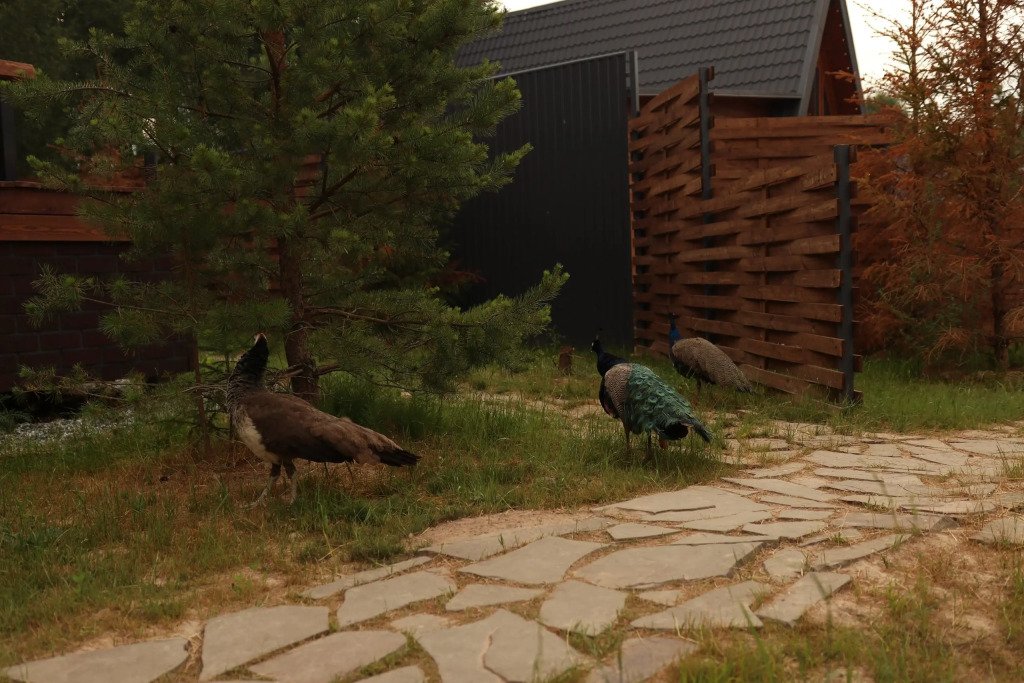 По территории гуляют павлины, кролики, гуси и кошки, а в 50 метрах — дикий берег, где можно искупаться или порыбачить.