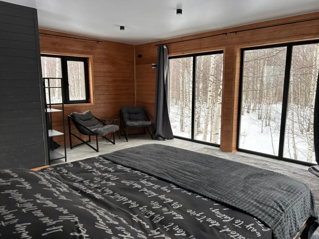 - уютная спальня на втором этаже с панорамным видом на лес;