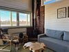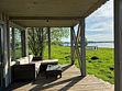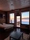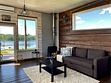 Панорамная гостиная с видом на озеро, обеденной зоной, дровяной печью, диваном, креслами, телевизором. Кухня с плитой, духовкой, микроволновкой, холодильником, тостером, чайником, посудомоечной машиной, посудой.