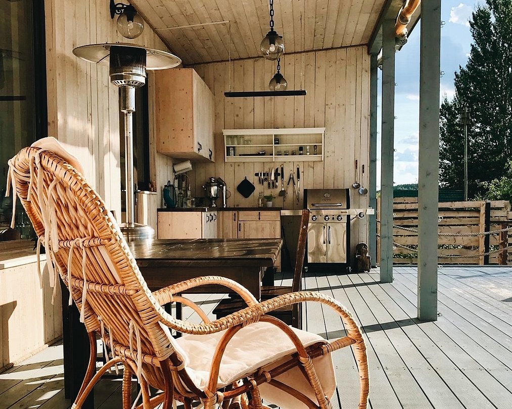 Кухня с плитой, микроволновкой, холодильником, чайником, посудой. Просторная терраса с ротанговой мебелью, на которой удобно валяться и любоваться озером, и зона барбекю, чтобы жарить самые вкусные стейки.