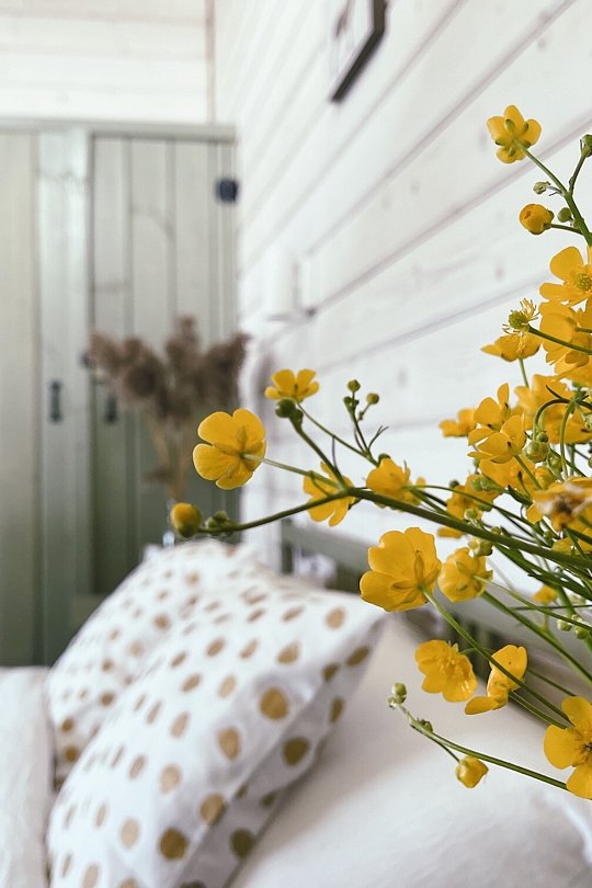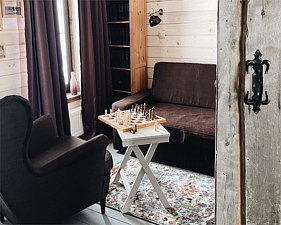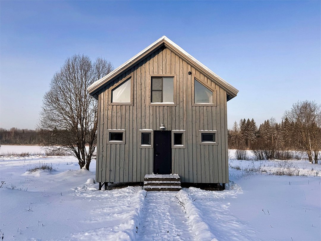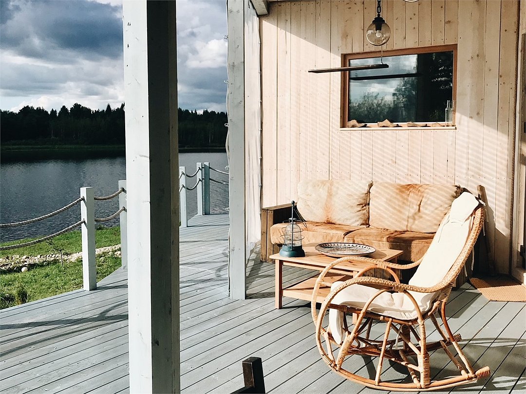 Коттедж в скандинавском стиле с гостиной и отдельной спальней с великолепным видом на озеро и густой лес. Площадь 80 м². Домик оборудован всем необходимым для вашего комфорта — санузел с душем и туалетом, кухня с набором посуды, холодильником, плитой, микроволновкой и чайником.