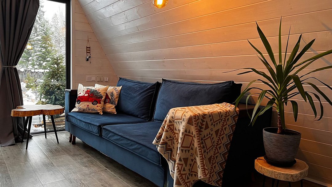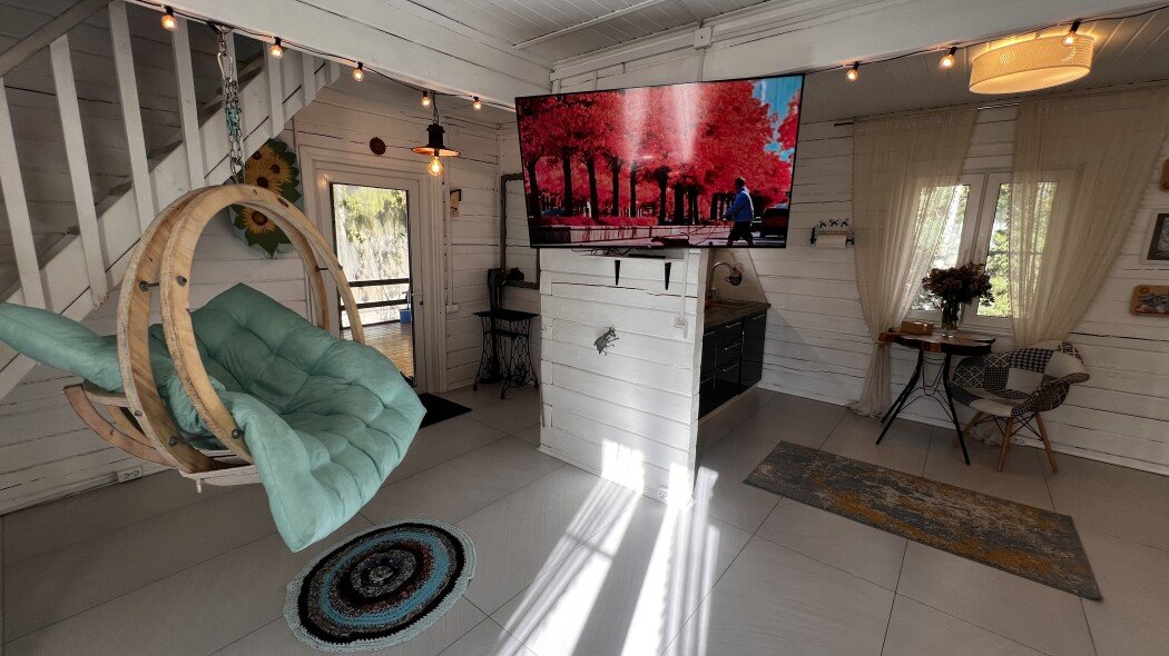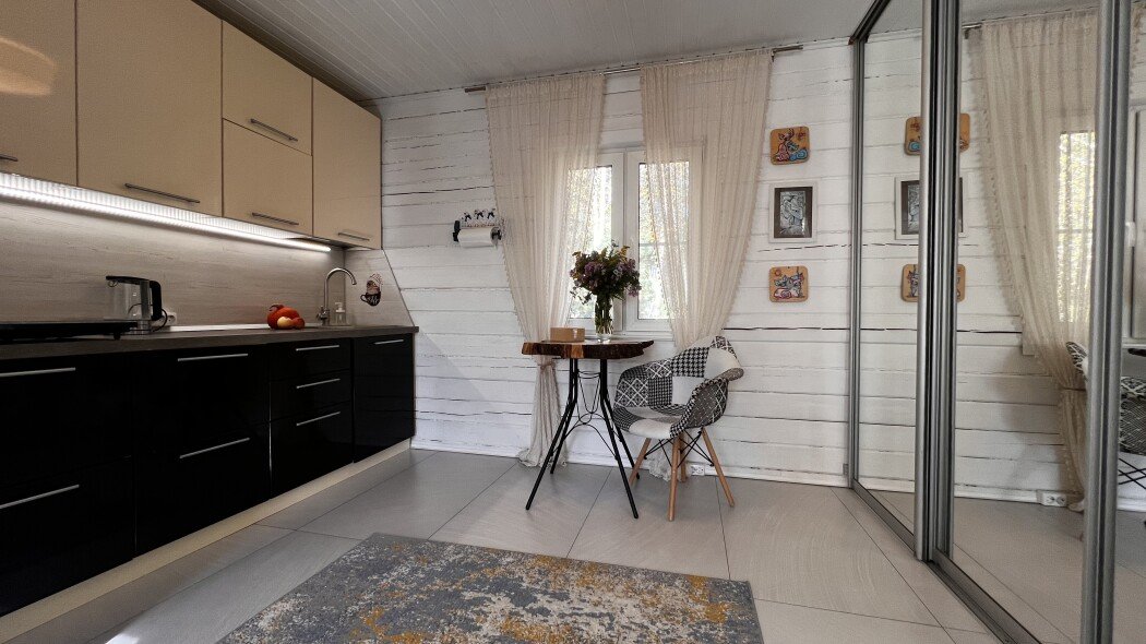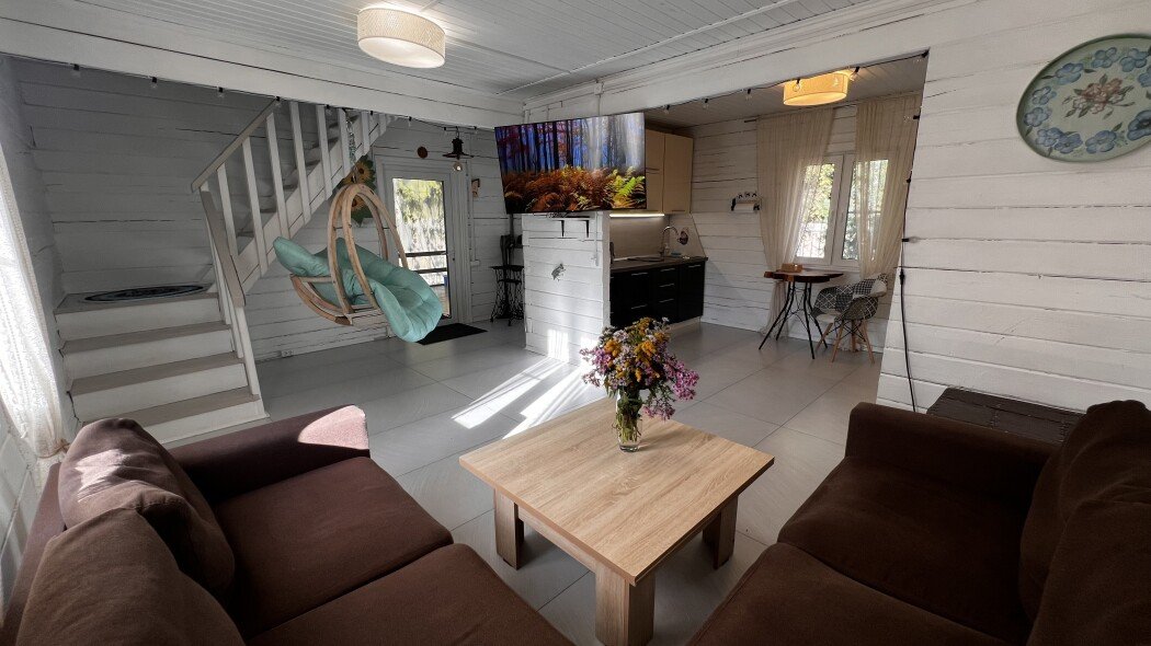 Домик общей площадью 60 м² и просторная терраса 18 м² с уличной мебелью и зоной отдыха. На первом этаже находится кухня-гостиная: большой холодильник, индукционная плита, посудомоечная машина (таблетки), стиральная машина (гель для стирки), чайник, тостер, современная посуда в большом количестве, гейзерная кофеварка, заварочный чайник, кастрюли, сковородки, чай, сахар, соль, подсолнечное масло, уксус и моющие средства. Диван раскладывается в большое спальное место (160х200). Полностью оборудованная обеденная зона!